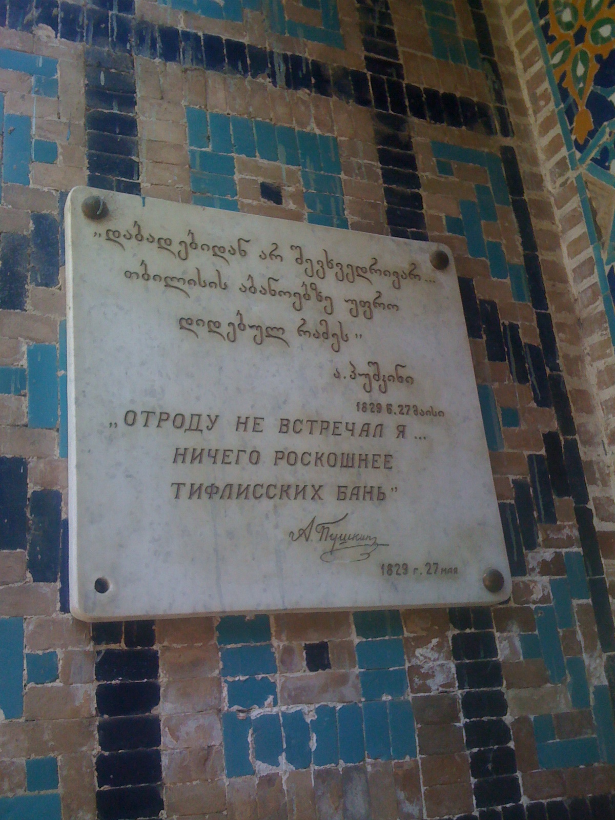 Sign on the wall of the Orbeliani bathhouse commemorating Alexander Sergeyevich Pushkin’s visit and his quotation: “I have never encountered anything more luxurious than this Tbilisi bath”.
