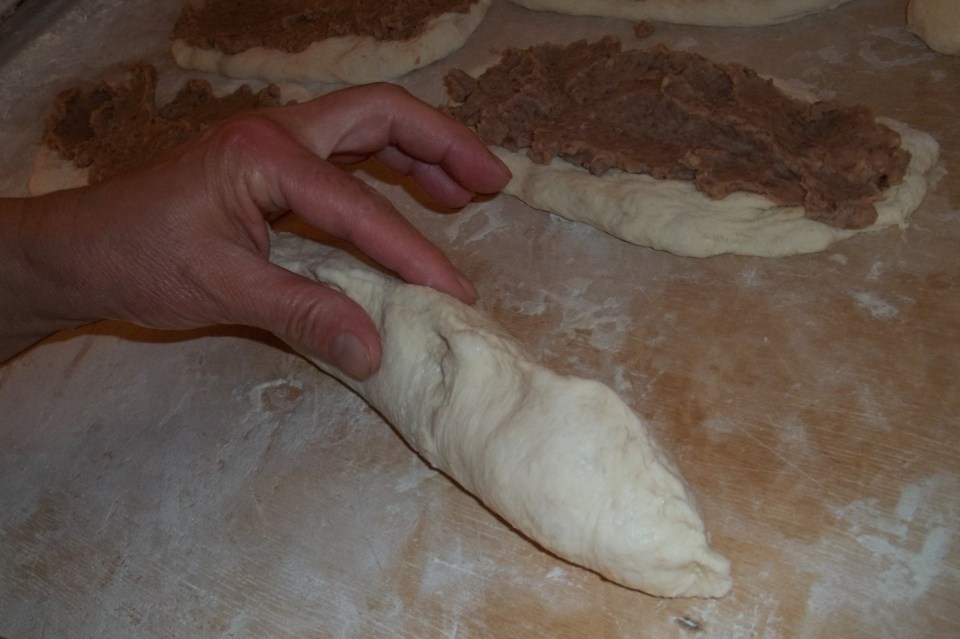 Pinching the Dough to Seal in Lobiani Bean Mixture