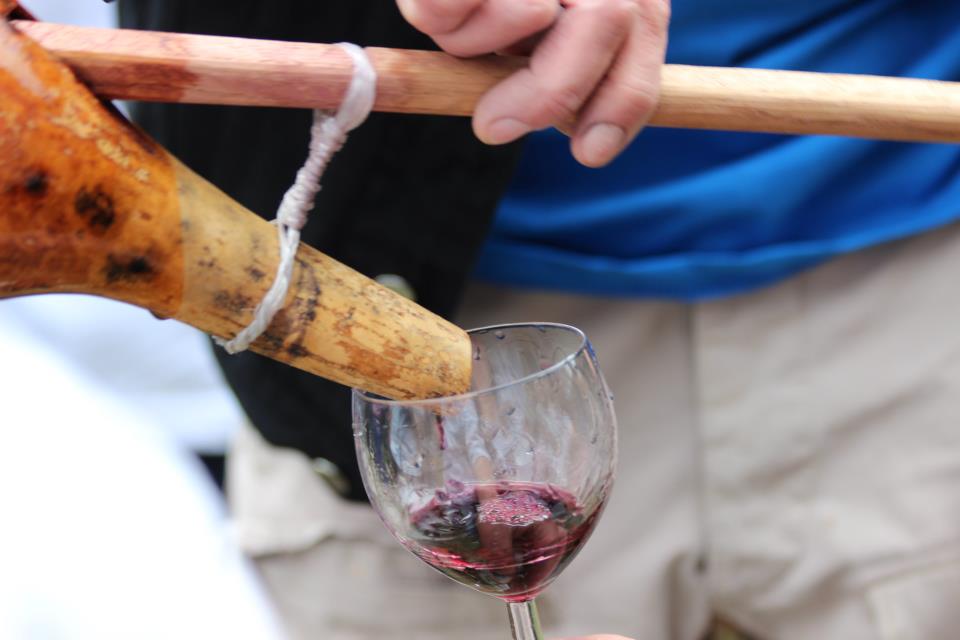 Using an orshimo (long-handled gourd) to pour wine ladled from a kvevri