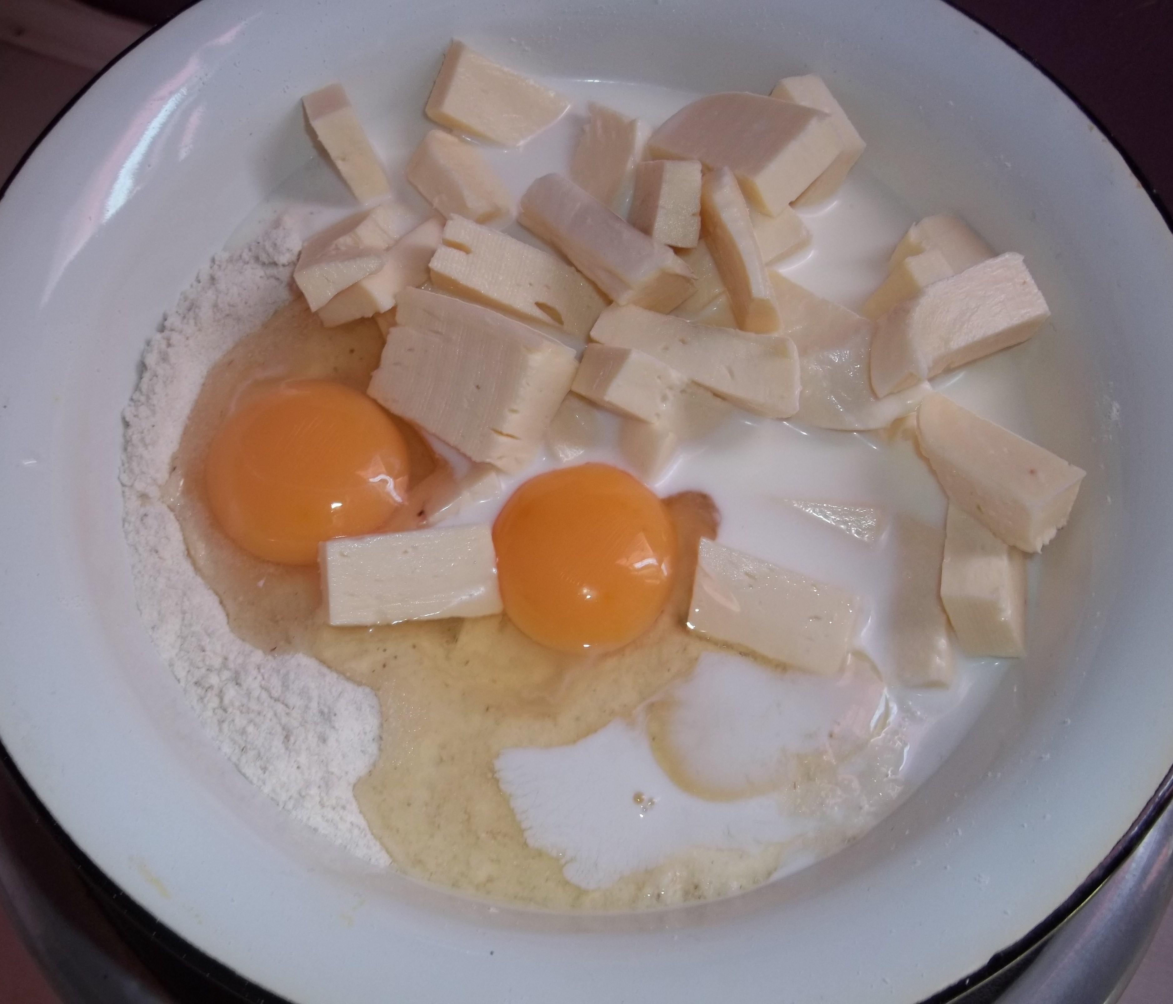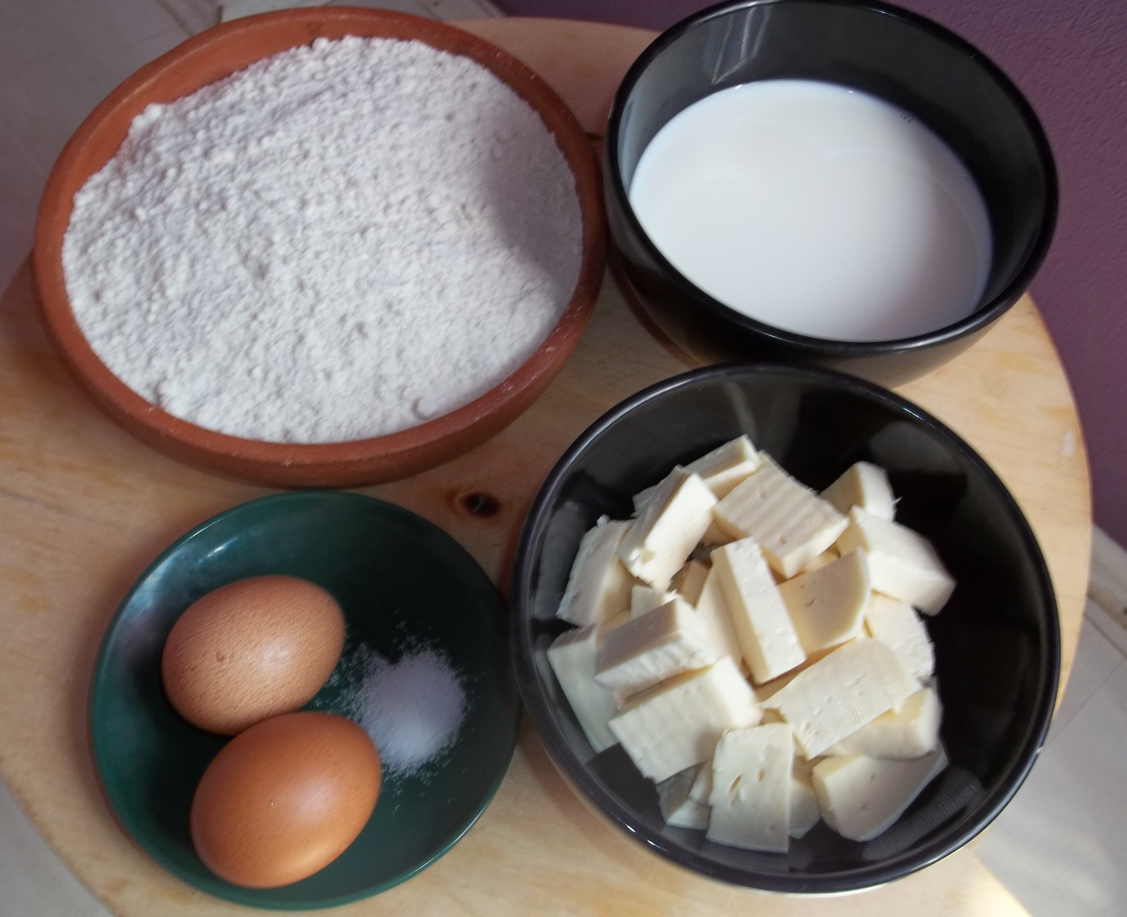 2 eggs, 70 ml of oil, 350 ml of milk, or water and salt (only if the cheese is not salty).