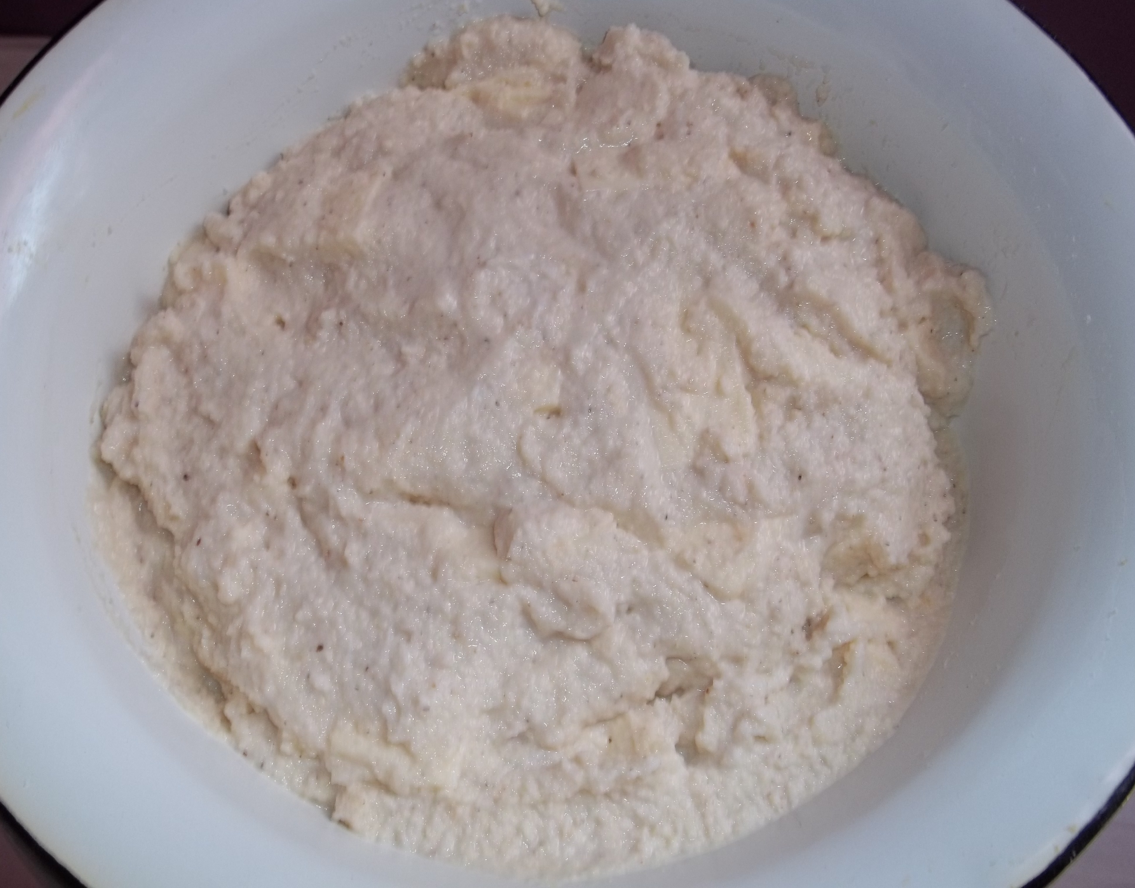 Mix the ingredients with hands or wooden spoon until the mixture looks like the photo below. The cheese should not be mashed during this process – the aim is to fully cover it.