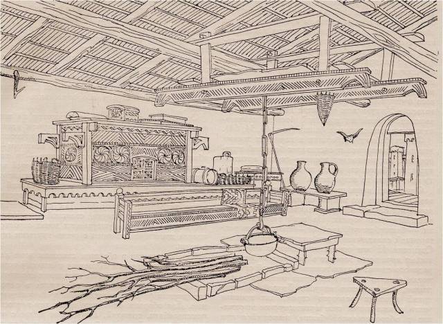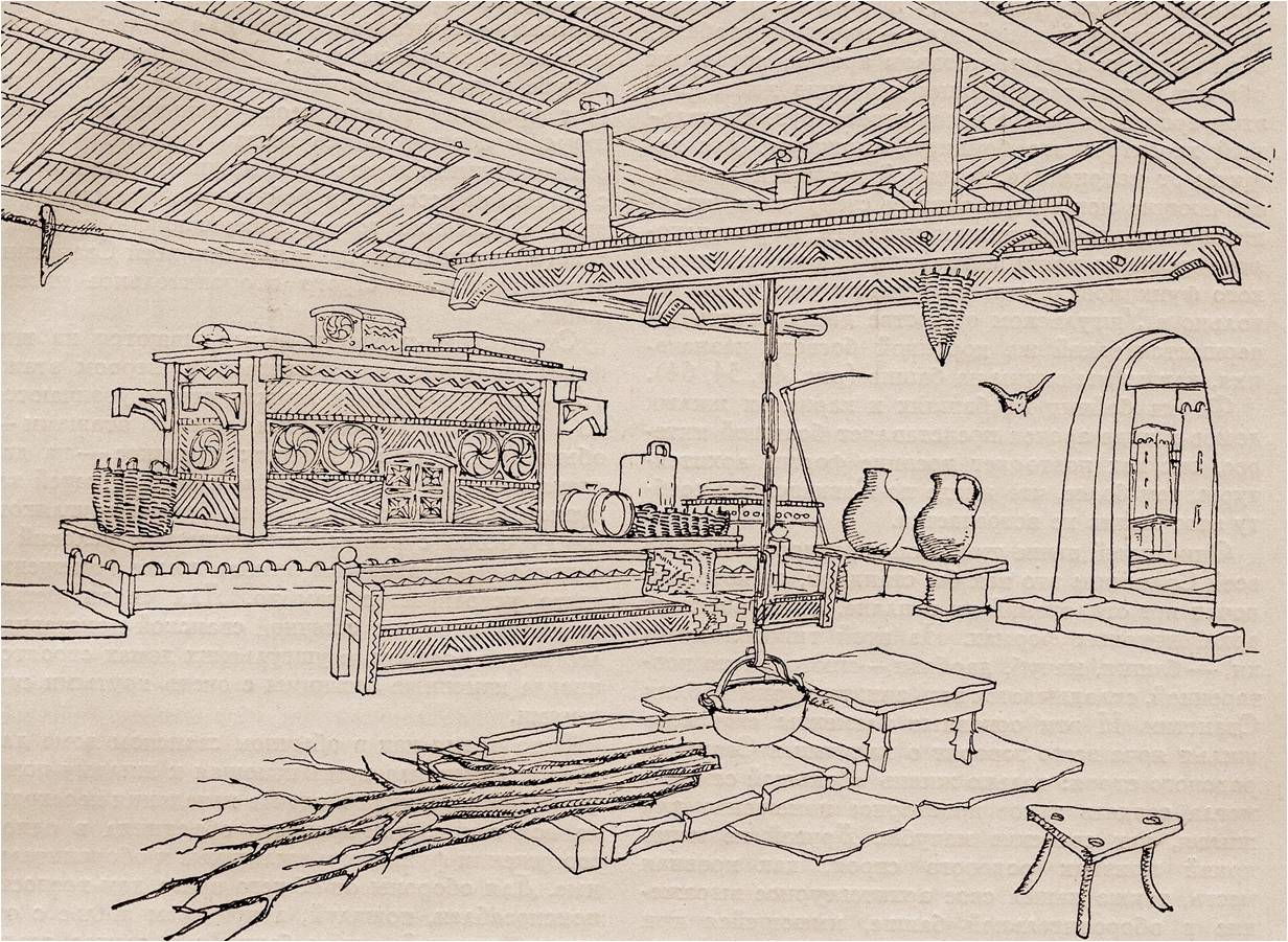 The house was heated by an open hearth in the centre of the hall, where food was also cooked. The residential unit was completed by a low boundary wall that enclosed an adjoining courtyard with stables and accessory structures.