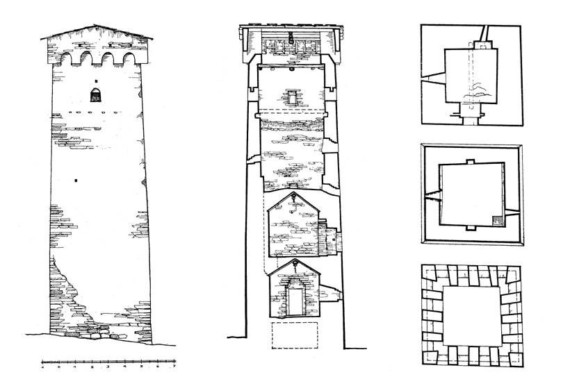 Drawing of a defensive tower of Chazhashi (Ushgul) floor plans, elevations, cross sections. ICOMOS Georgia Study funded by Getty Grants Foundation