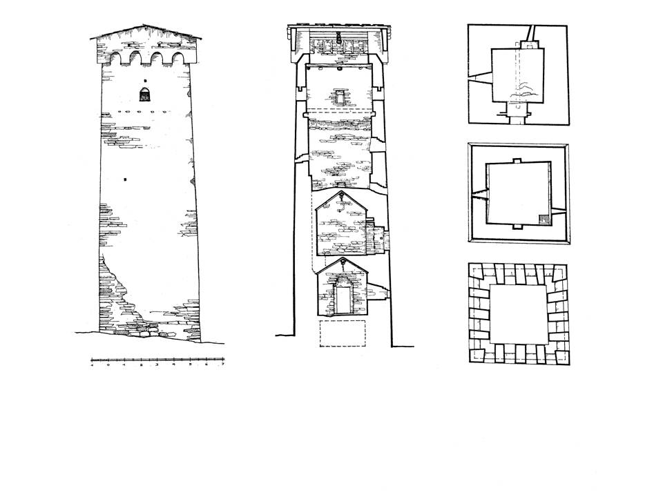 Drawing of a defensive tower of Chazhashi (Ushgul) floor plans, elevations, cross sections. ICOMOS Georgia Study funded by Getty Grants Foundation
