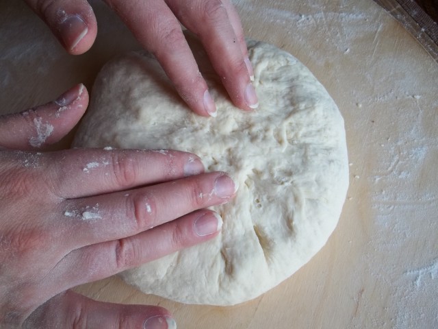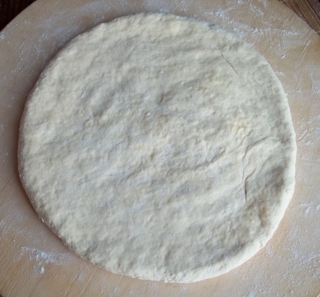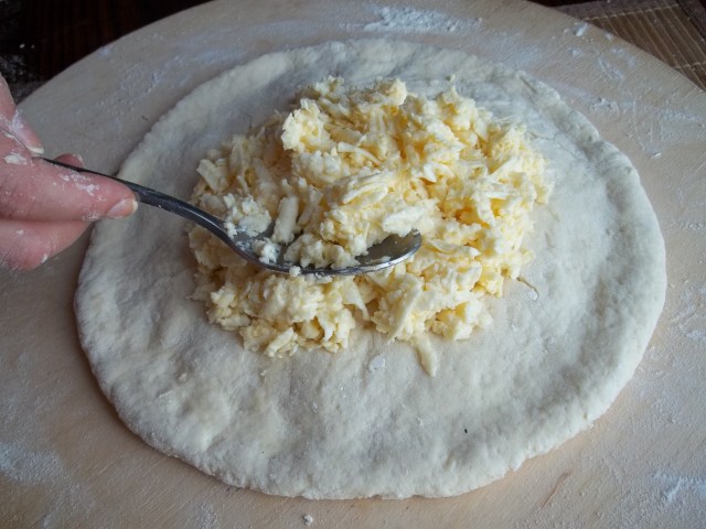 Knead the dough before using. Leave for 10 minutes and then make a circular shape, with a lip around the edge, like in the picture below. Spread the cheese filling onto the middle of the dough.