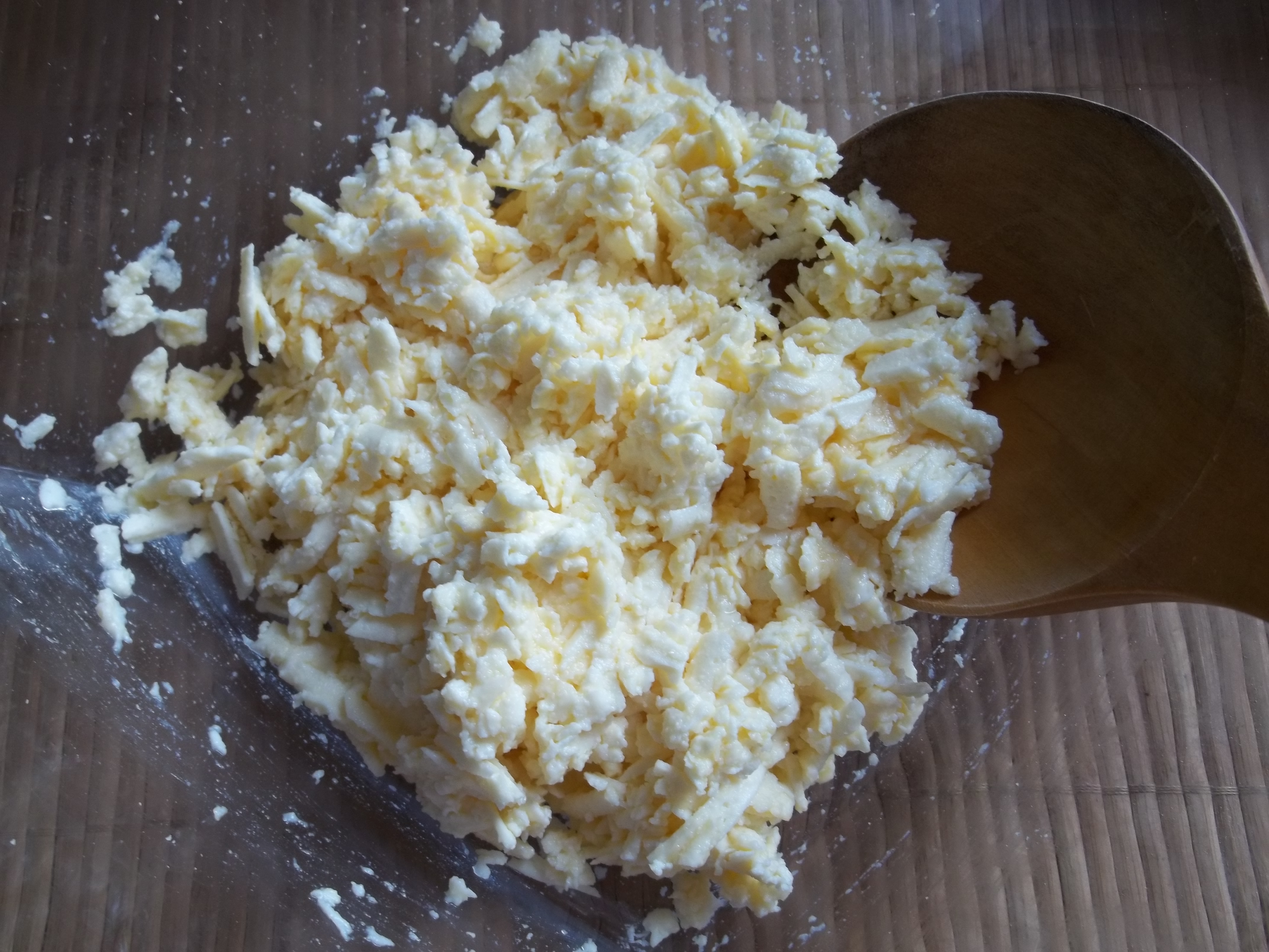 Add the grated cheese, one egg and 20 grams of butter to a mixing bowl.
