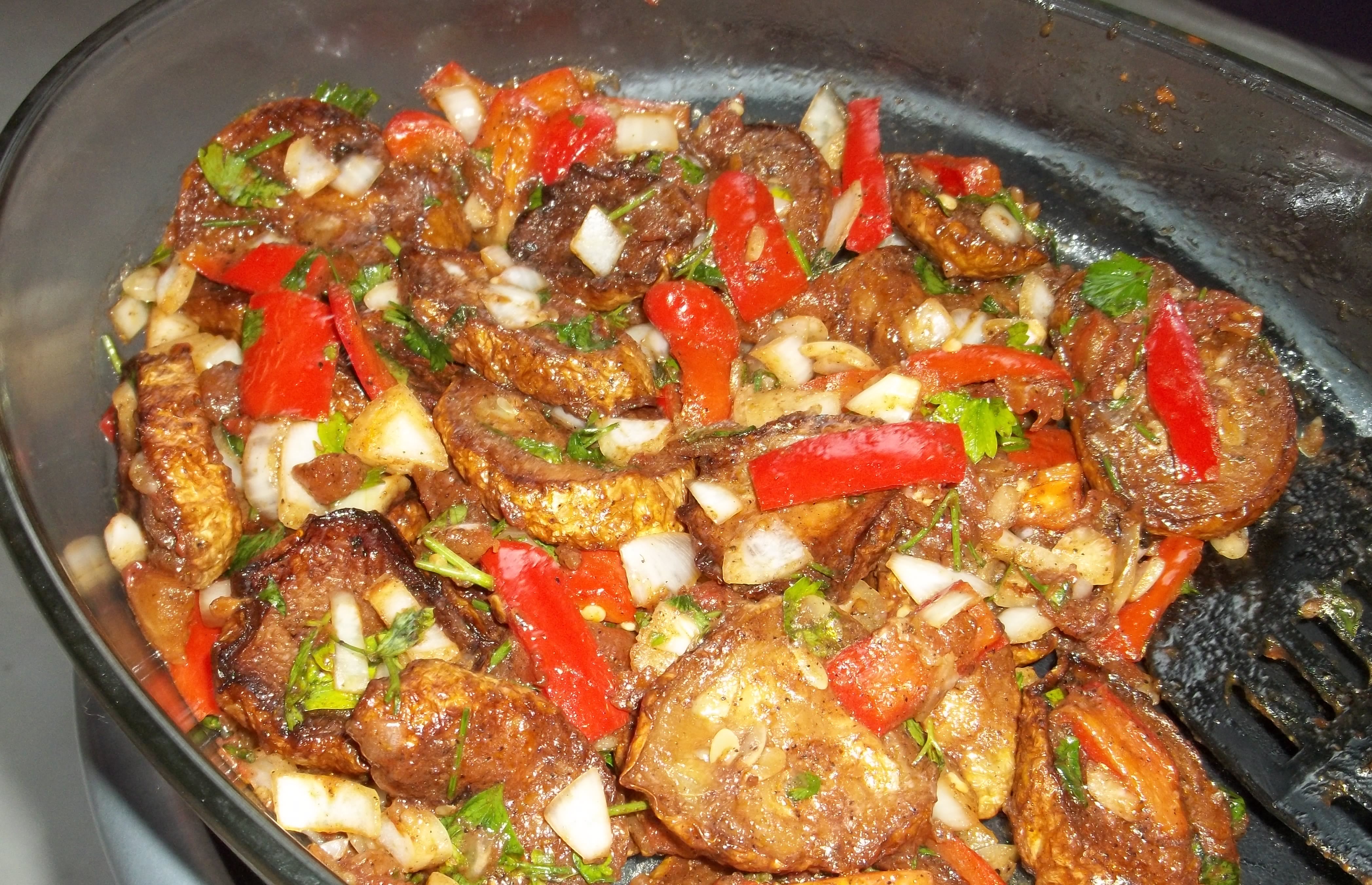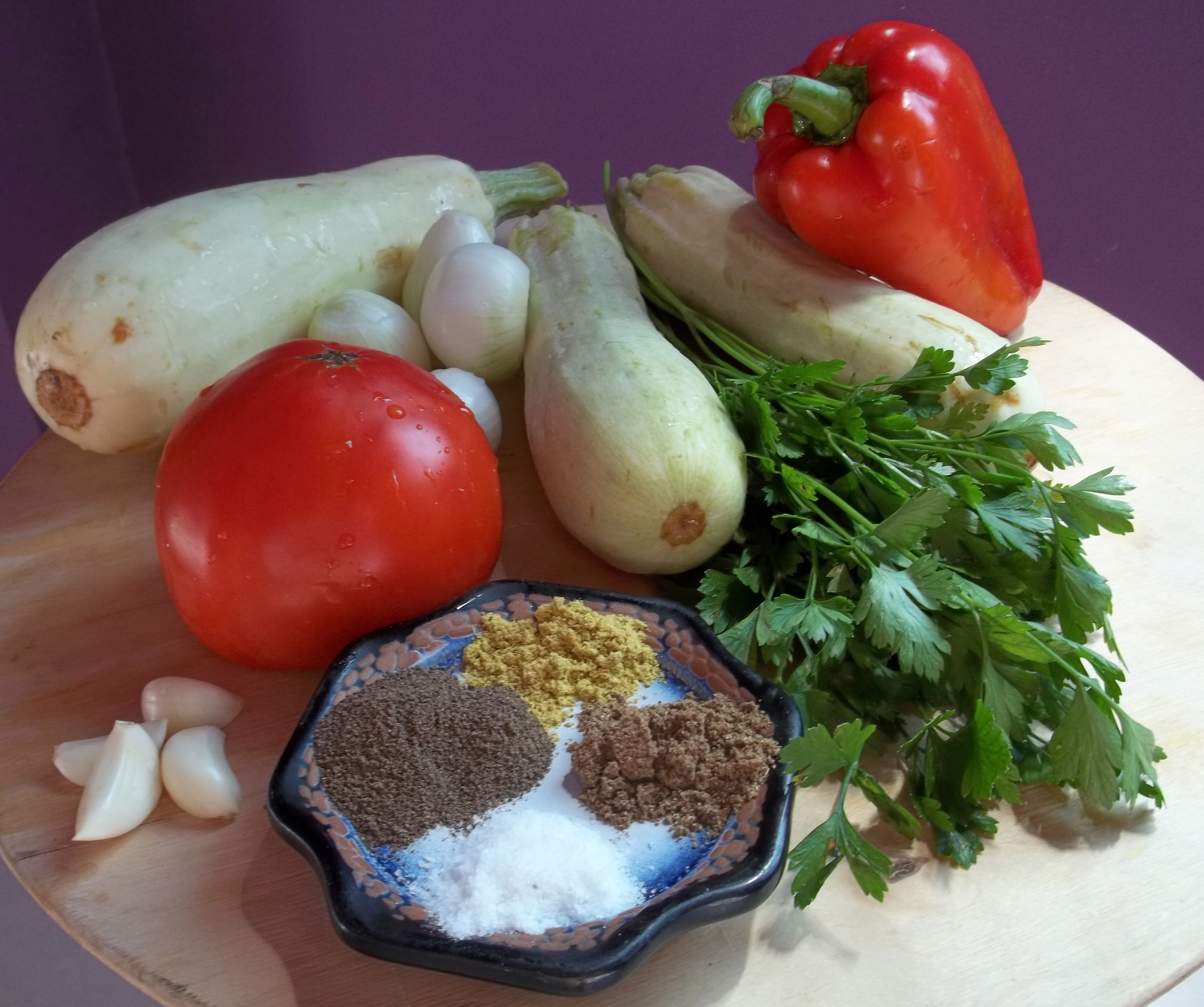 Ingredients (serves 3): 600 grams of marrow, 1 large sweet pepper, 150 grams of white onions, 1 large tomato, 70 grams of fresh parsley, 4 cloves of garlic, 100 ml of oil, 2 tbs of vinegar, half tsp of dried coriander, 1 tsp of black pepper, half tsp of dried Blue Fenugreek, salt (according to taste).