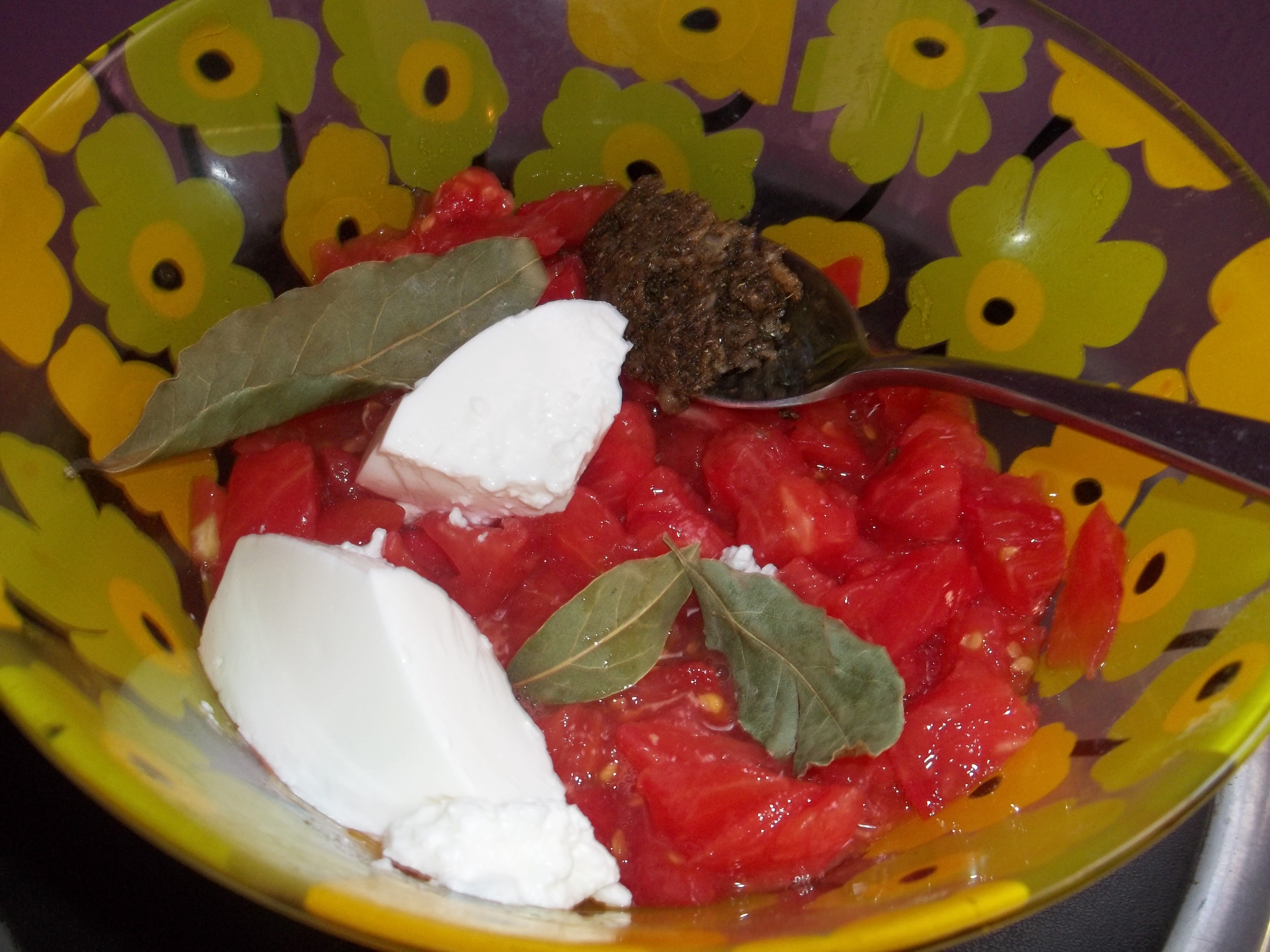 Cut the tomatoes into medium slices and add to a mixing bowl with half of the crushed garlic and spice mixture, a bay leaf and sour cream. Mix all ingredients with a spoon, ensuring that the sour cream is thoroughly mixed in. Then add half a liter of water and 1 tbs of oil and mix again. When finished, put the bowl to one side.