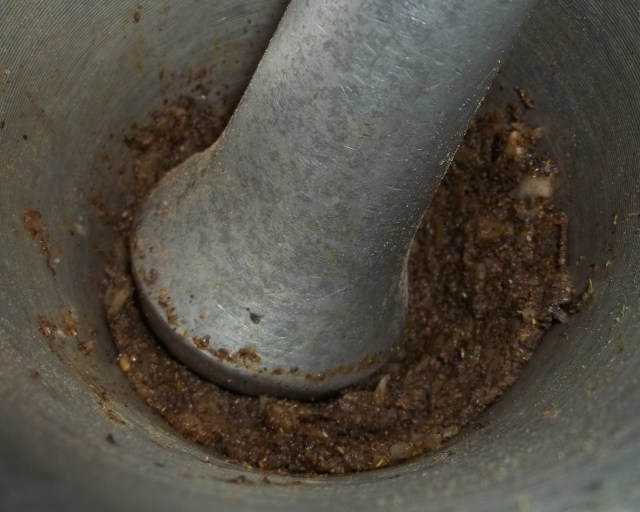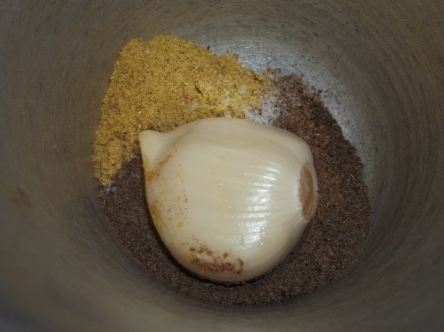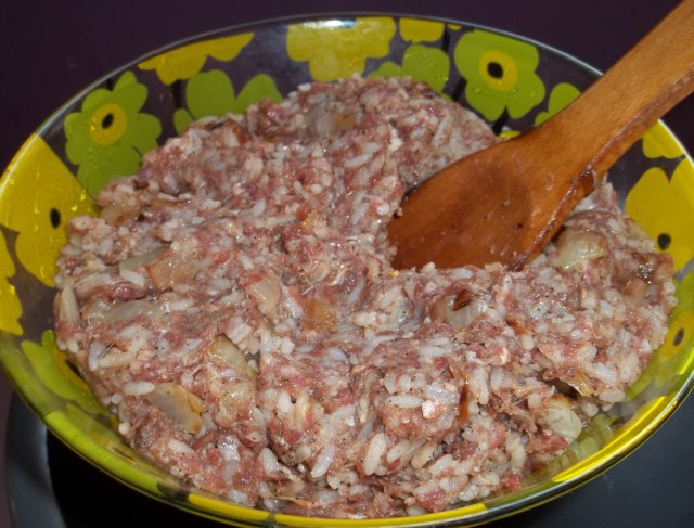 Boil the rice in salty water, being careful not to over-boil it. Chop and fry the onions in oil. Add the cooked rice and onions to a mixing bowl. Add the meat and the remaining half of the crushed garlic and spice mixture.