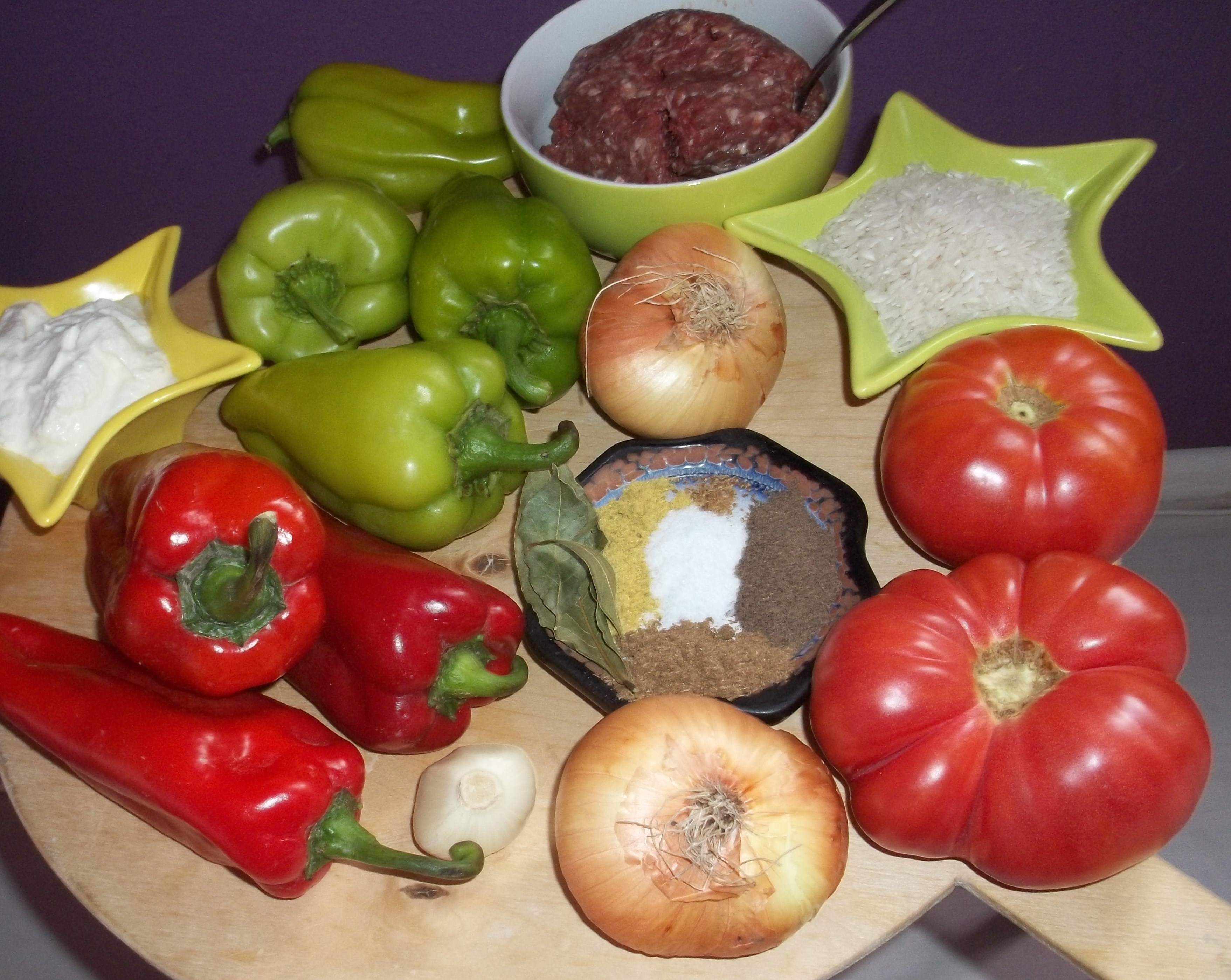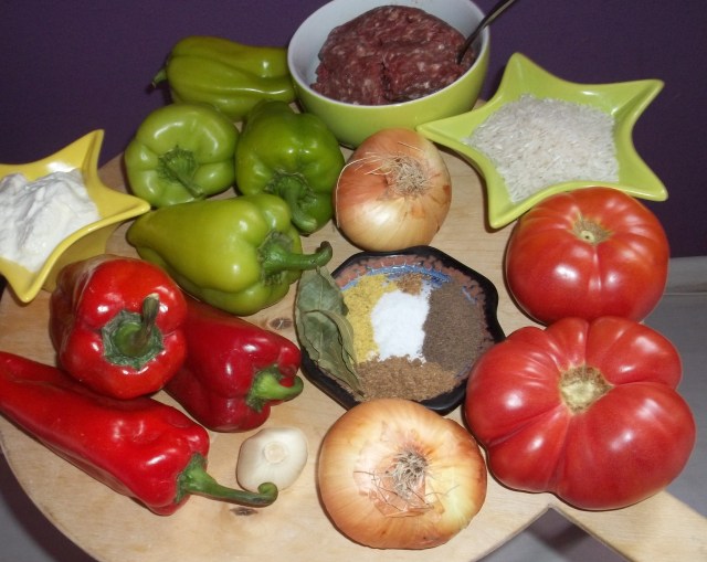 Ingredients (serves 7): 7 large peppers, 300 grams of ground beef/pork mix, 80 grams of rice, 2 cloves of garlic (we used 1 very large one), 2 large onions, 2 large tomatoes, 3 table spoons of sour cream, 3 bay leaves, black pepper, 1 tsp of blue fenugreek, 1 tsp of dried coriander, salt and 30 ml of oil.