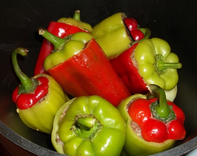 Add the filled peppers to a deep pan, making sure the peppers stand up.