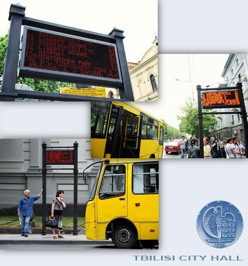Electronic indicator boards at bus stops display bus route information and arrival times in Georgian and English.