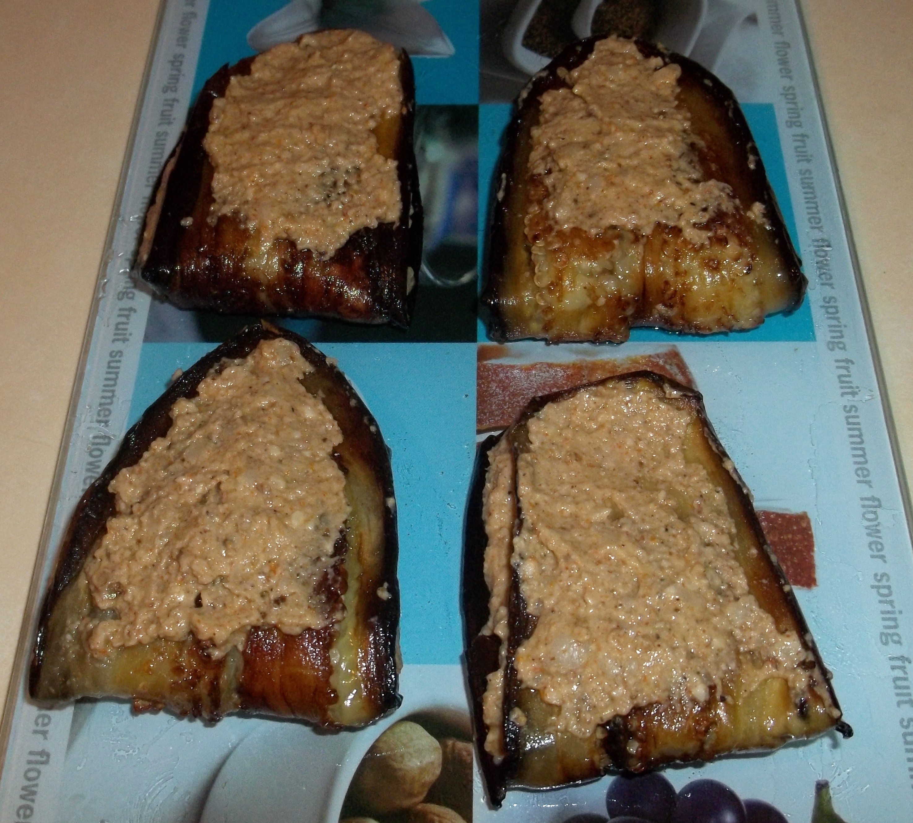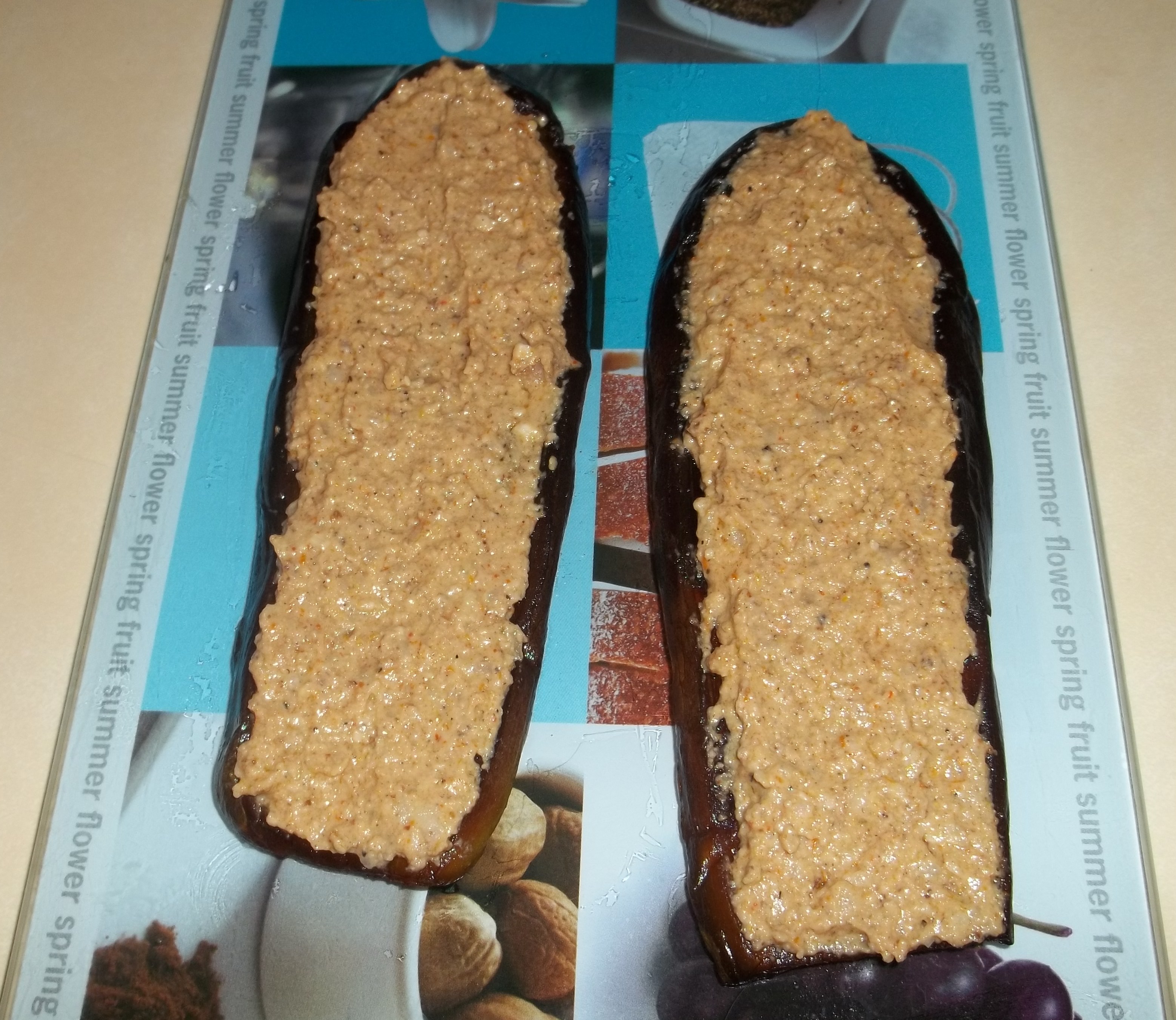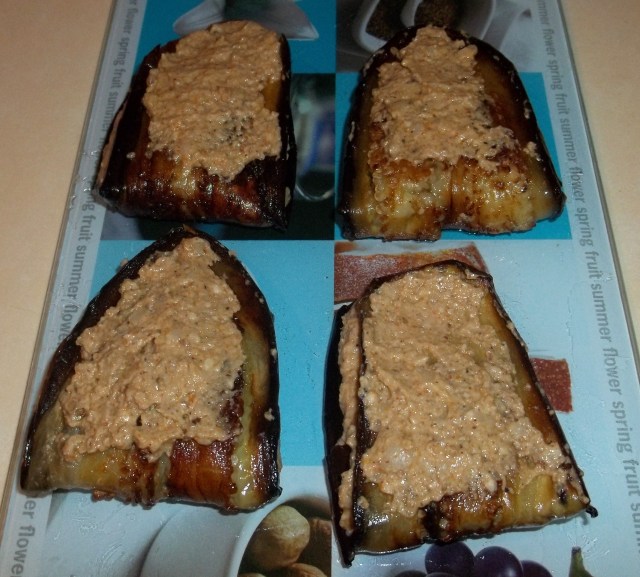Spread more walnut mixture onto the top of each folded eggplant.
