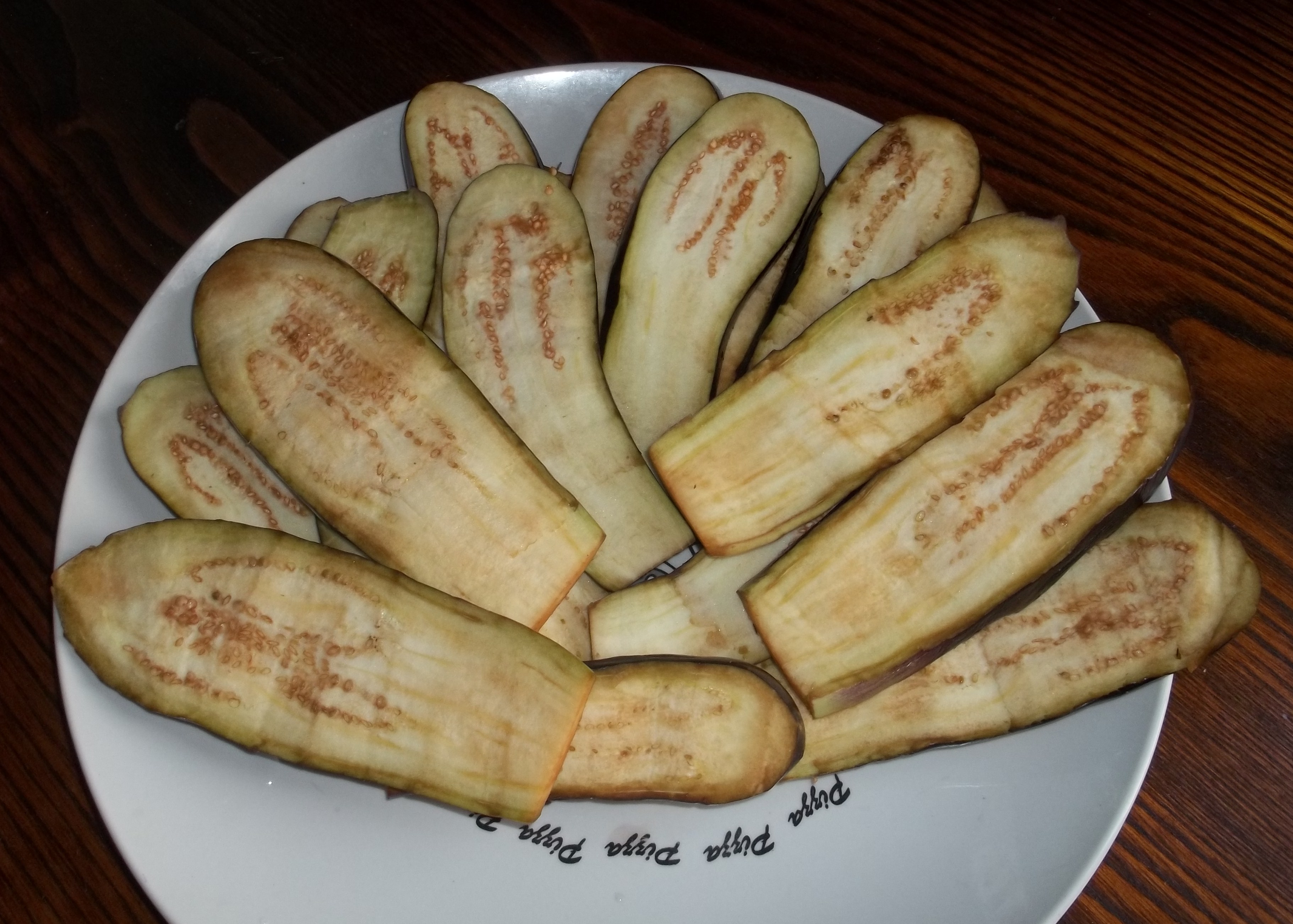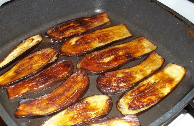 Slice each eggplant length ways into 4 or 5 pieces.