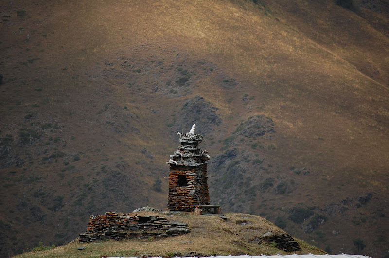 Each khati is dedicated to a local saint (formerly a deity). Several are dedicated to a ‘black’ St George (associated with the local god Ashara) and a ‘white’ St George. They are sometimes fenced off or have a stone wall around them. Women are not permitted to approach the shrines. Female visitors should respect this important aspect of the Tushetian culture.