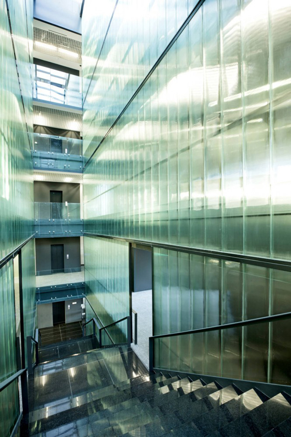 The choice of materials and the form have been chosen to reflect the function of the building. The stark geometry of the black frame represents the uncompromising nature of the legal system.