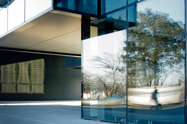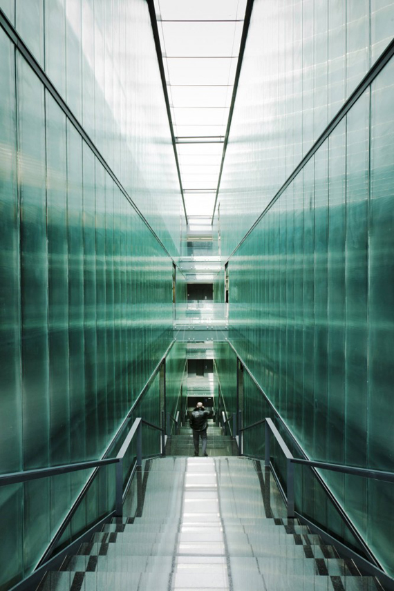 The interior uses glass to create a feeling of transparency and light, in stark contrast to the dark framework.