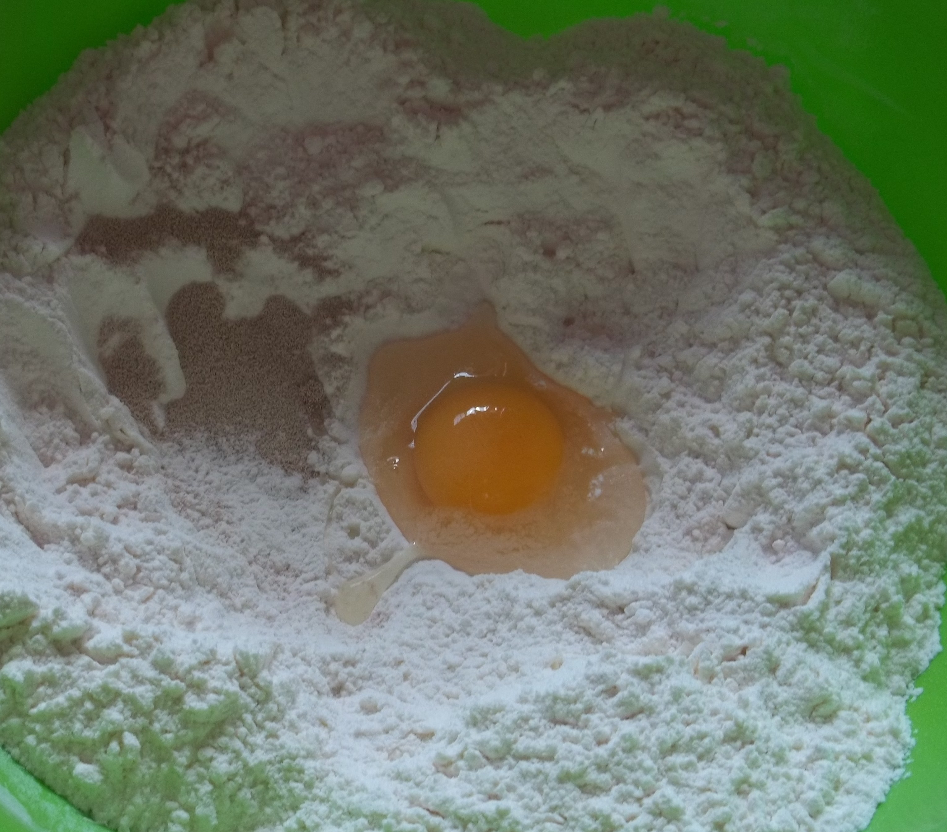 Preparation (dough): Add 800 grams of flour, 25 grams of yeast, half tsp salt and 1 egg to a mixing bowl.