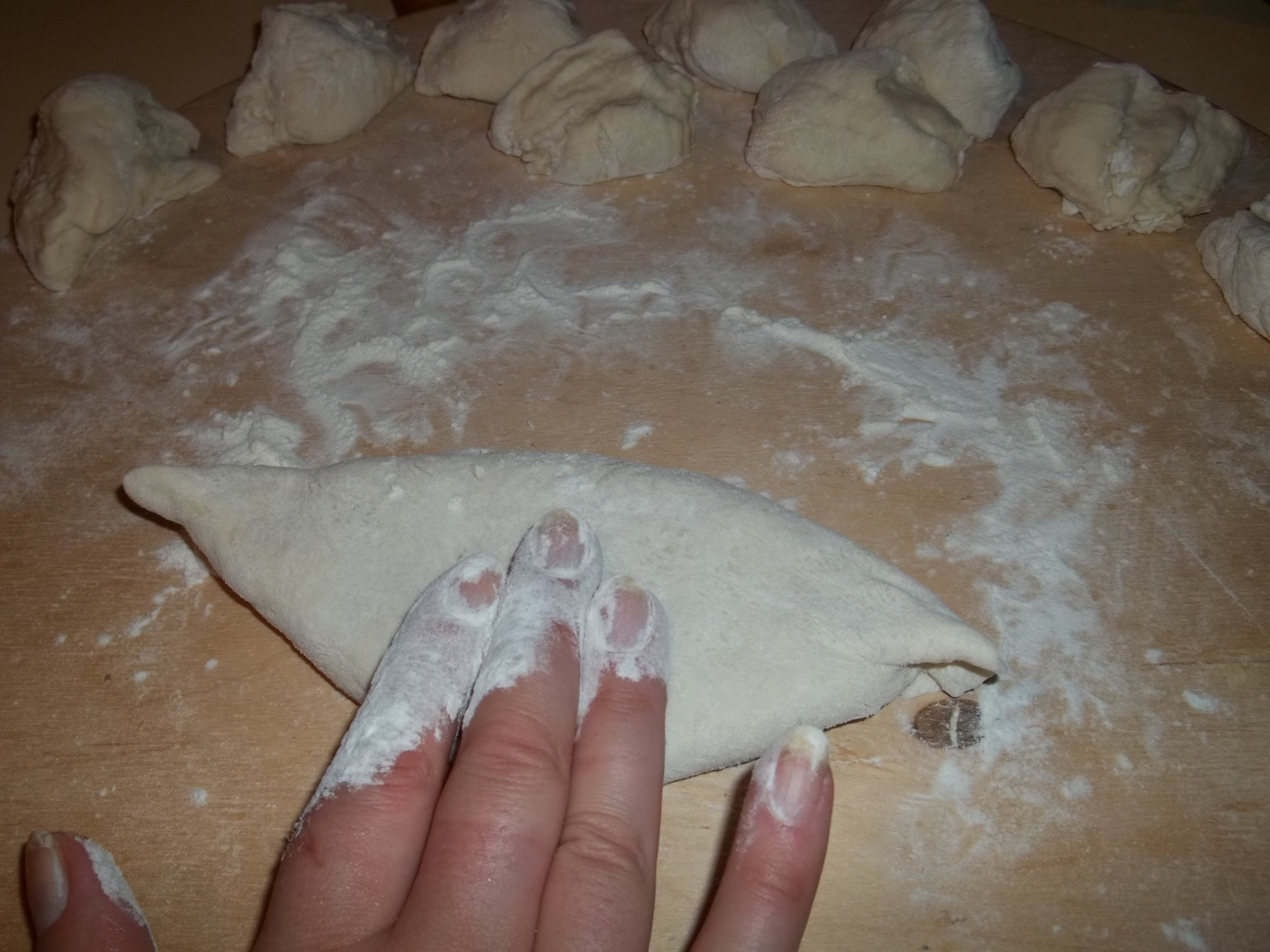 Add 200 grams of flour and knead the dough until it is fairly firm. Dust a work surface with flour and divide the dough into pieces.