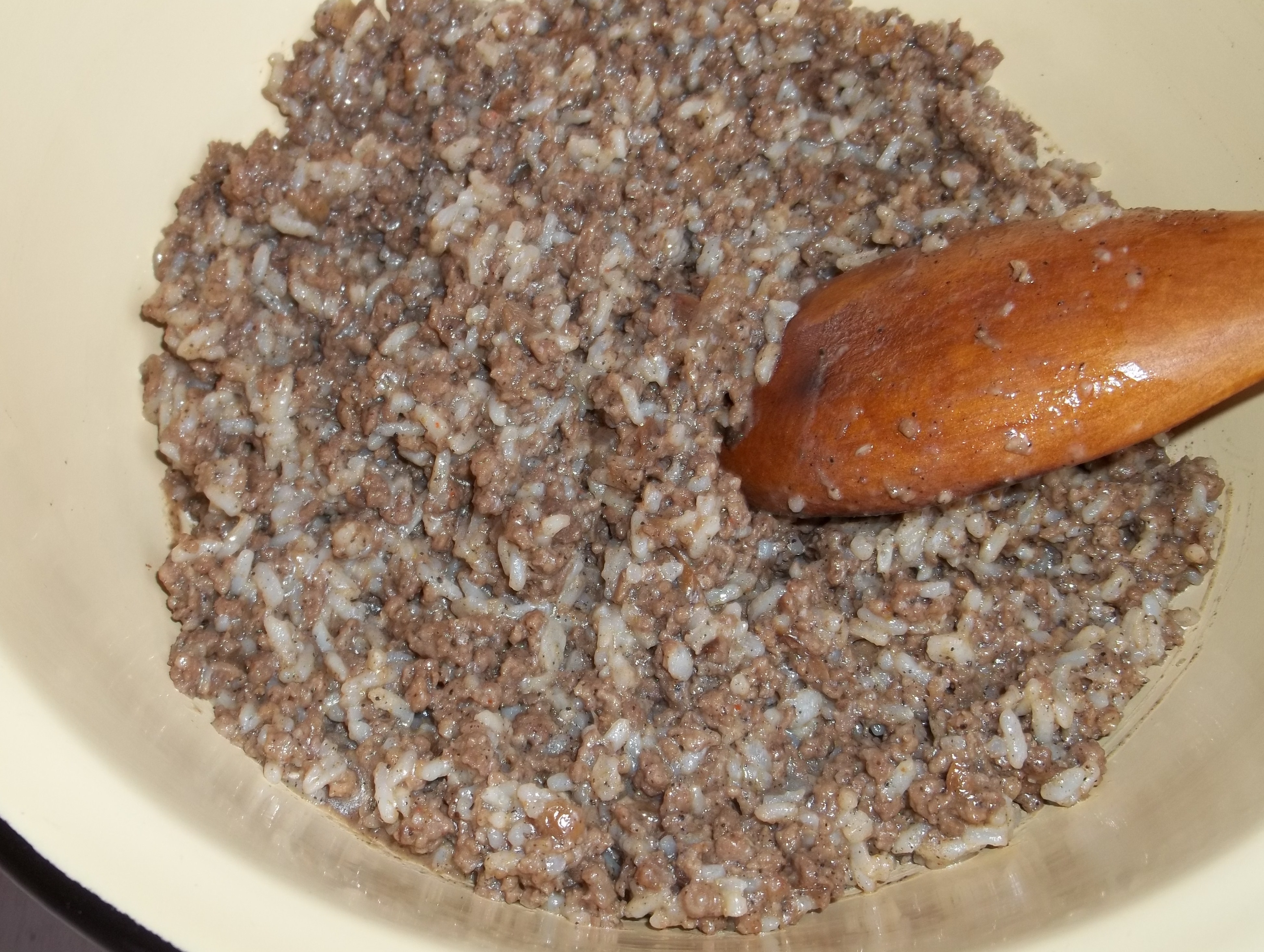 Boil the rice with 1 tsp of salt. Add the rice, together with the cooked beef and pork mix and 1 egg to a mixing bowl.