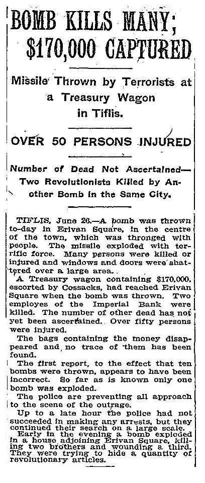 The audacious and violent robbery made headlines throughout the world: “Rain of Bombs: Revolutionaries Hurl Destruction among Large Crowds of People” in the London Daily Mirror, “Tiflis Bomb Outrage” in The Times of London, “Catastrophe!” in Le Temps in Paris, and “Bomb Kills Many; $170,000 Captured” in The New York Times.