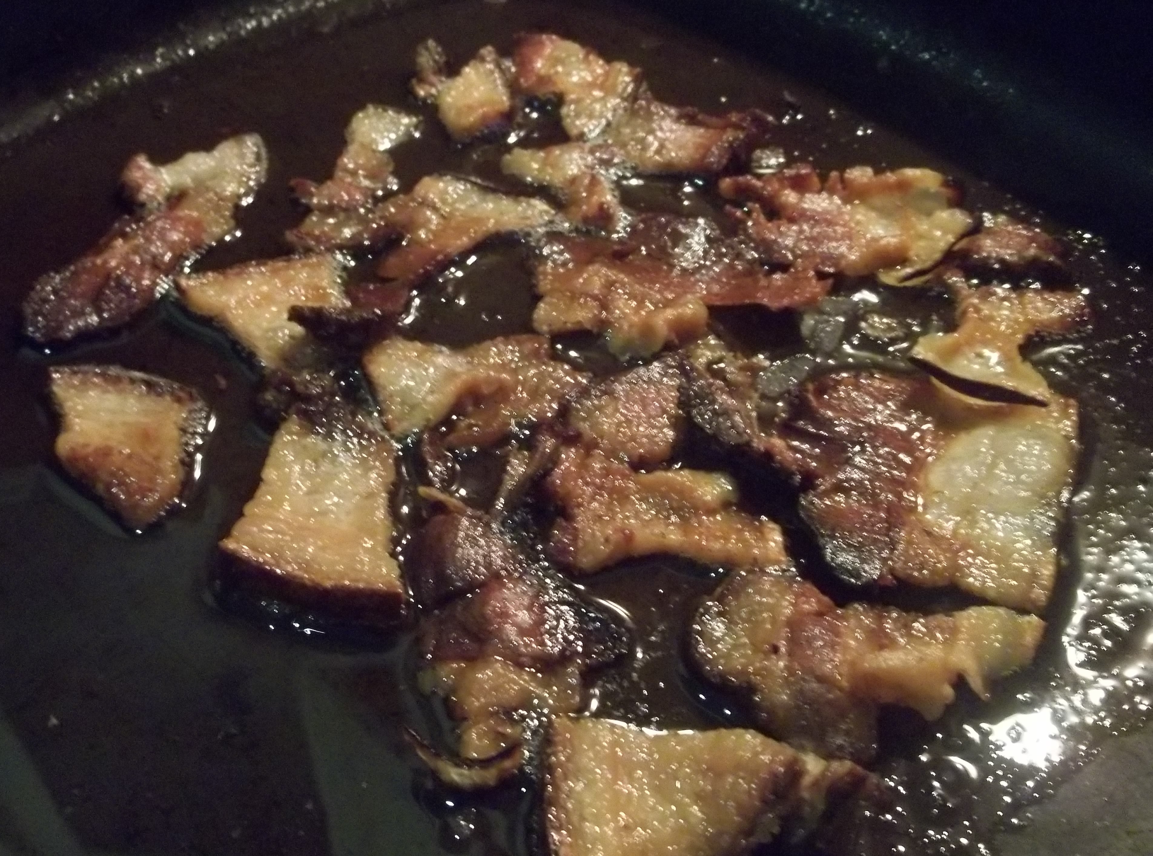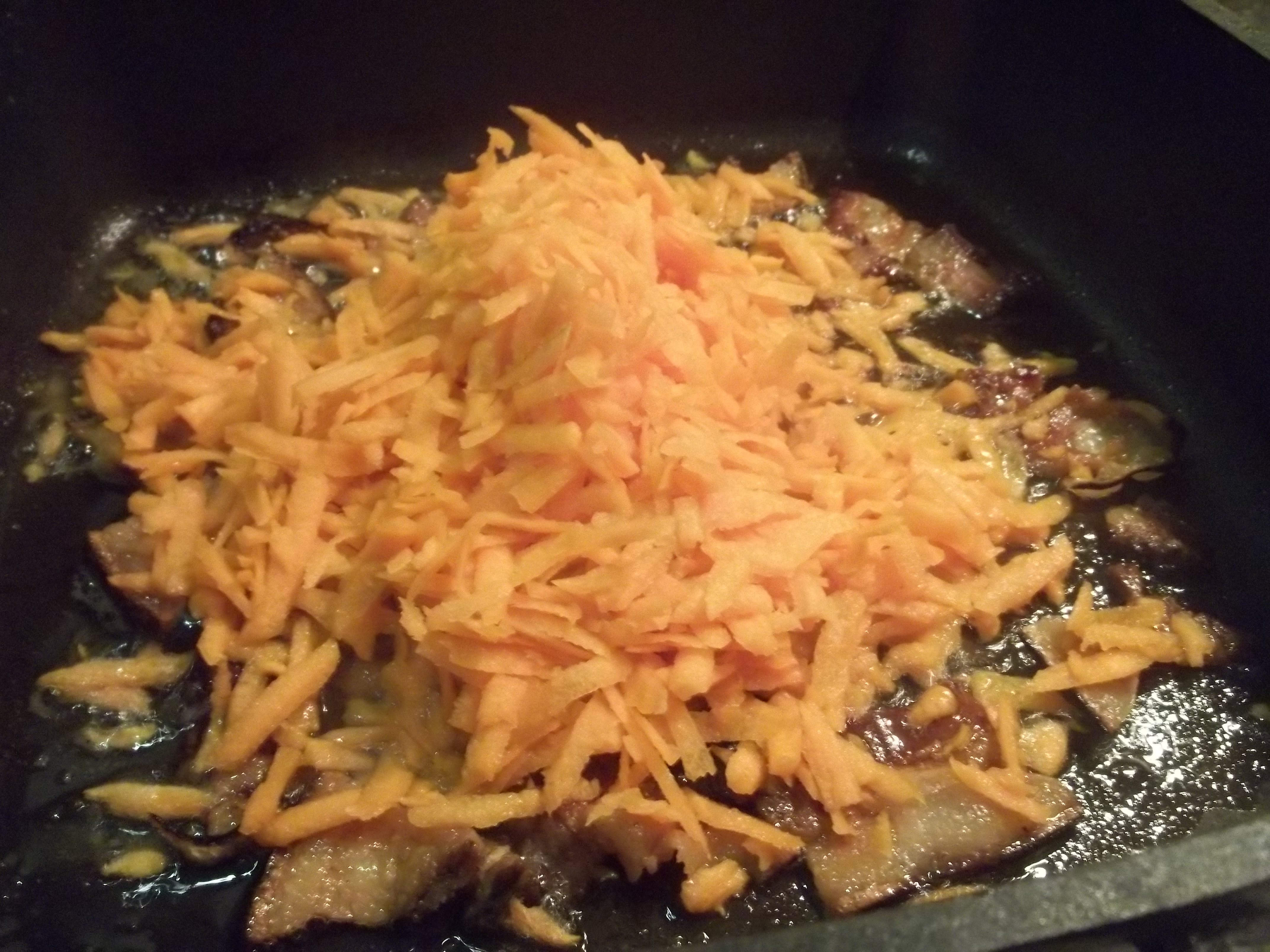 Shred the carrots, slice and chop the onions (not too thick) and crush the garlic clove. Add the carrots to the pan and fry on a low heat with the ham. The carrots will fry in the fat produced by the ham.