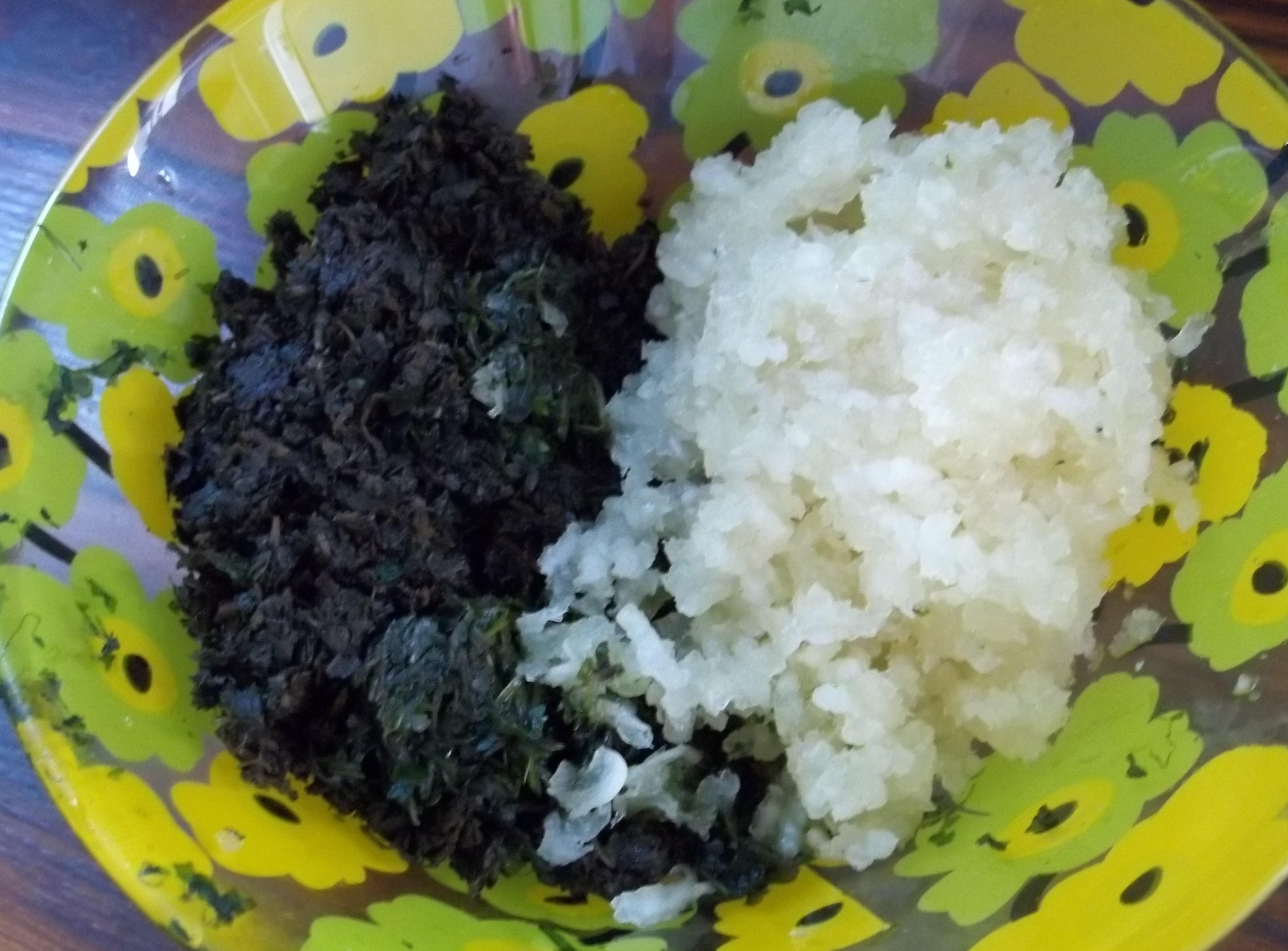 Crush the chopped coriander, Pennyroyal and green peppers together. Crush the garlic cloves separately. The herb mixture and the crushed garlic should look like the picture below.