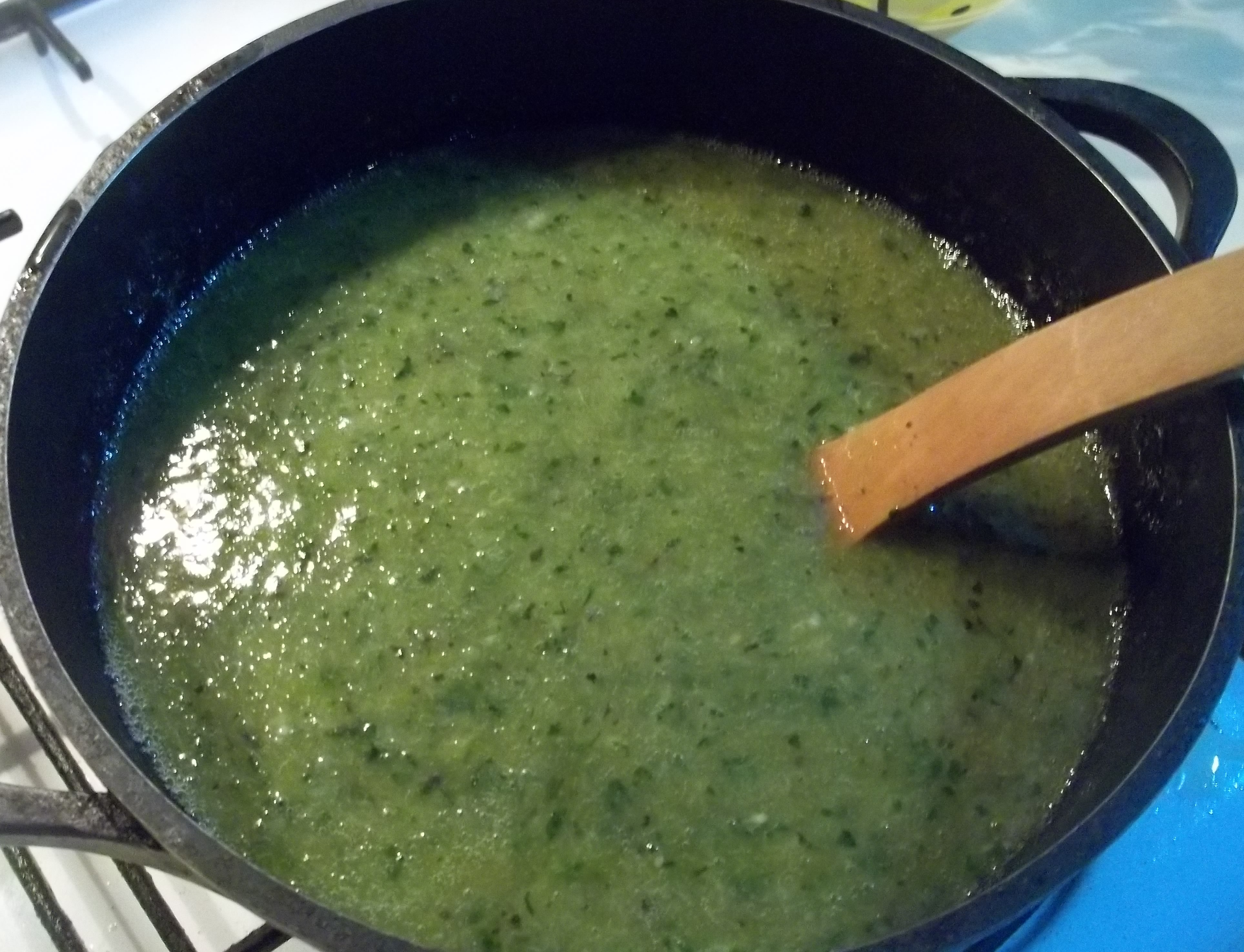 Add the coriander, Pennyroyal and green pepper mixture, together with the crushed garlic. Add salt (to your preference), stir to thoroughly mix and then heat on a medium temperature.