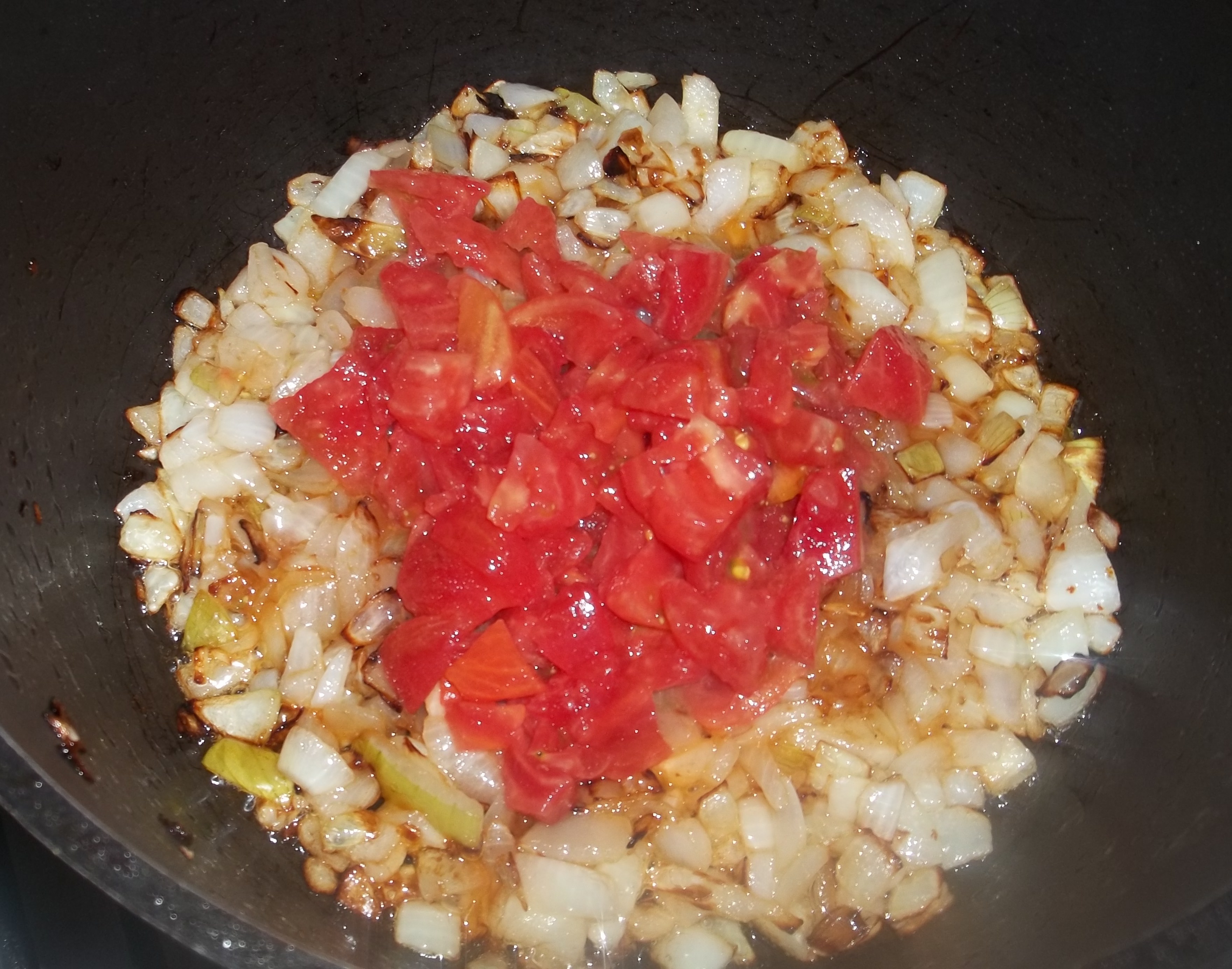 Chop the tomatoes and add, together with the fried onions, to a deep pot.
