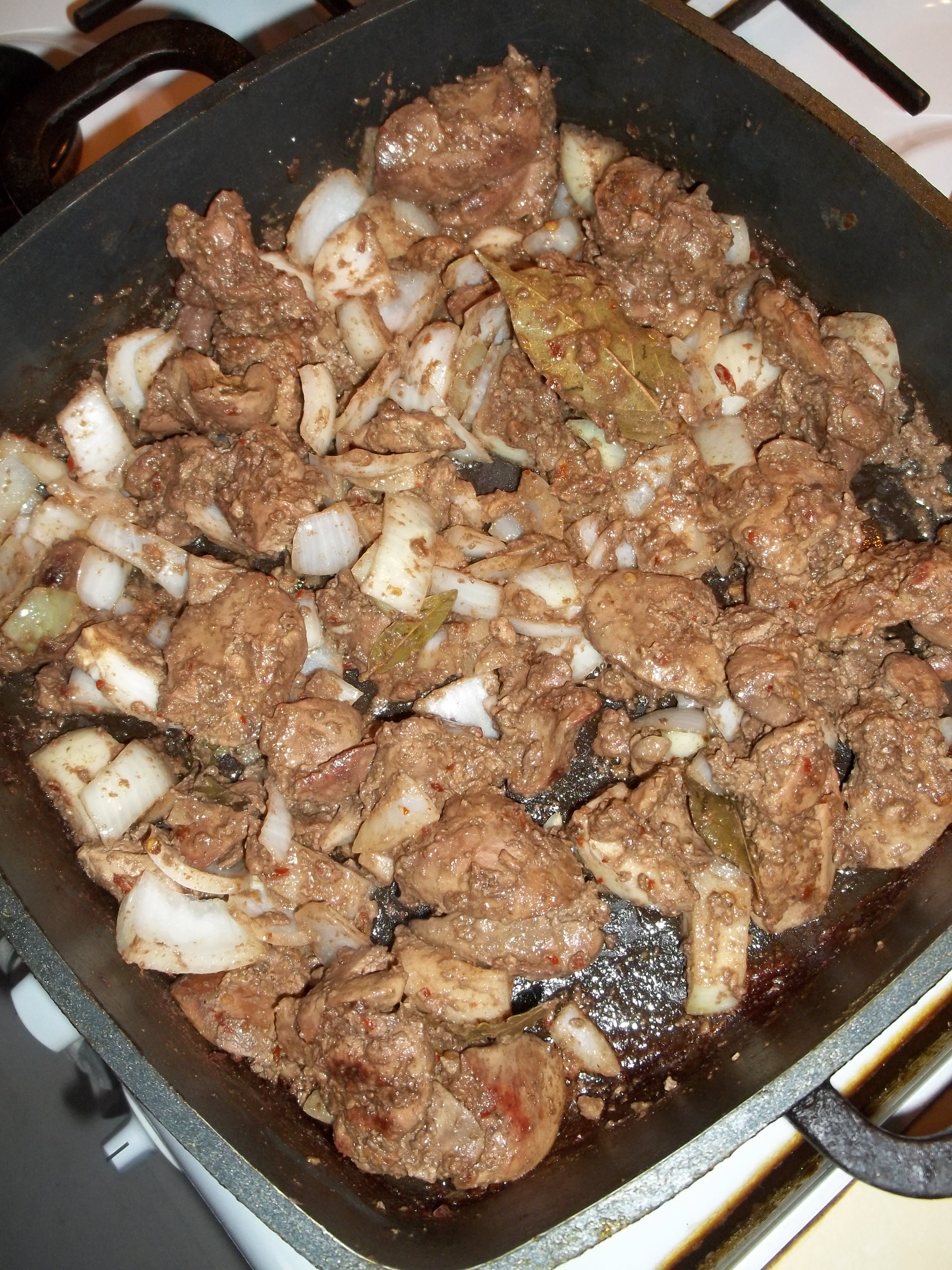 Ingredients (4 servings): 1 kilo of chicken liver, 4 bay leaves, 1 tbs coarse dried hot pepper, 1 tbs of Svanetian salt, 2 juicy tomatoes, 2 onions, 150 ml of red wine, 1 tbs of vinegar, 10 grams of fresh Basil and 8 tbs of vegetable oil.