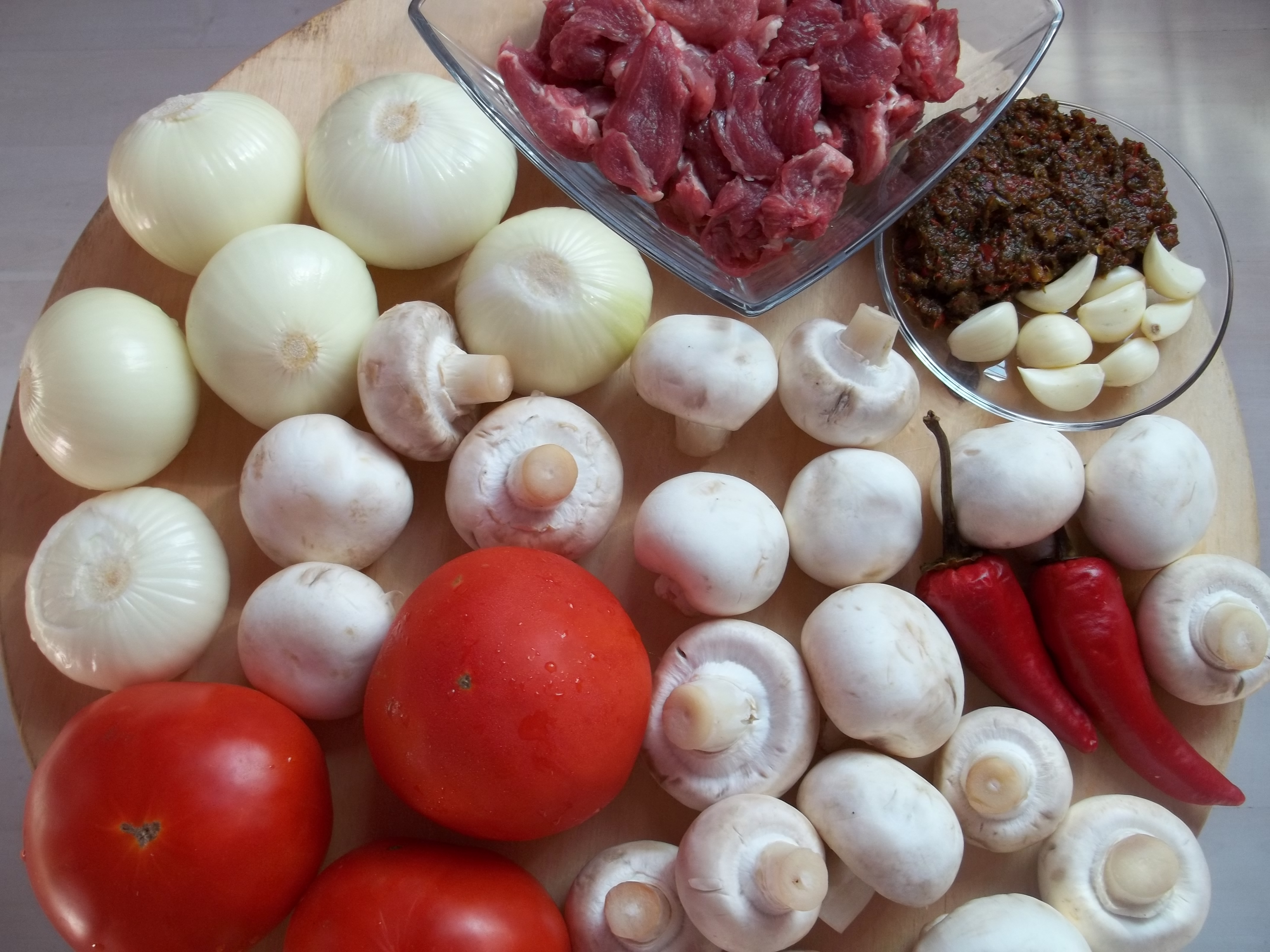 Ingredients (6 servings): 400 grams of pork, 500 grams of mushrooms, 6 medium white onions, 3 large tomatoes, 2 hot red peppers, 8-9 cloves of garlic, 150 ml of white wine, 100 ml of water, 2 tbs vinegar, 7 tbs of oil, and 1.5 tbs of Megrelian ajika (click link for recipe).