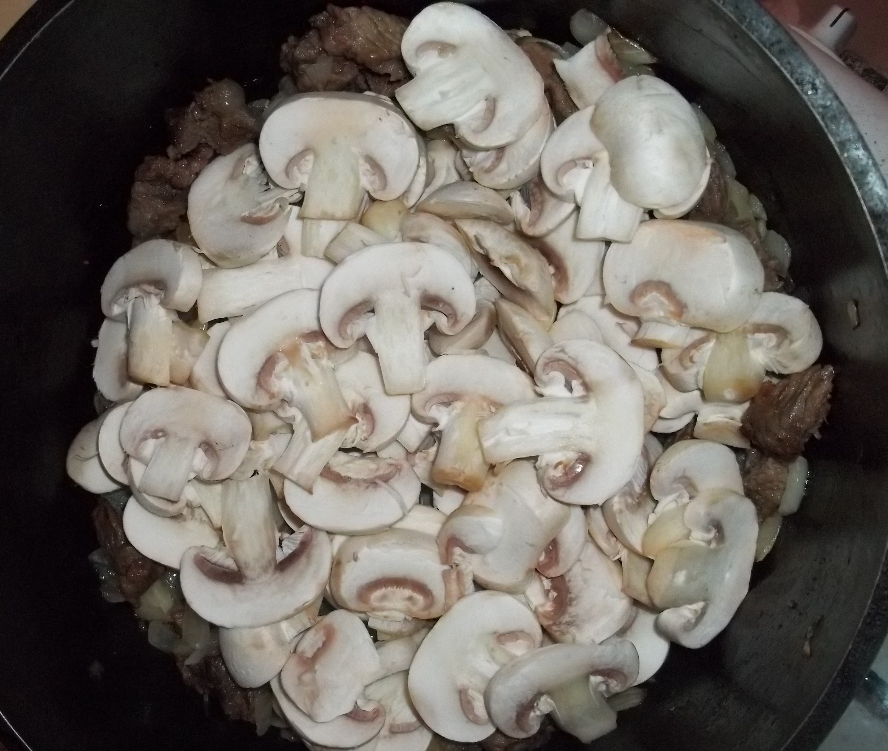 Cut the mushrooms into thin slices and add to the pot. Stir carefully. Cover the pot and cook on a very low heat for 30 minutes, stirring occasionally.