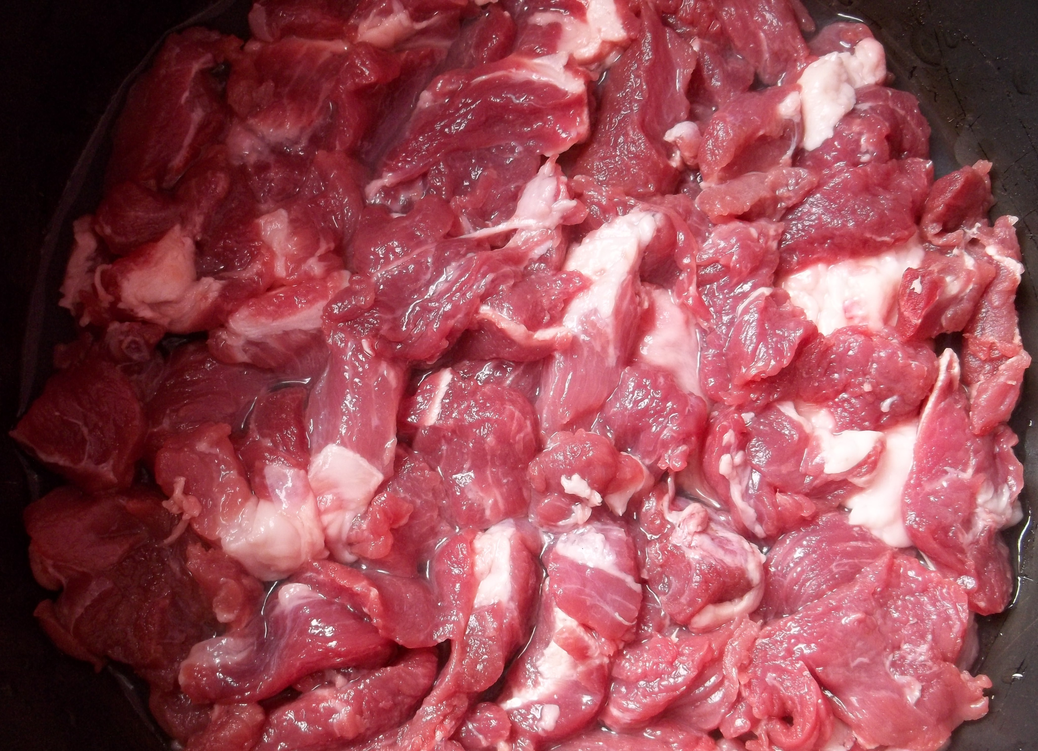 Preparation: This recipe will take about one and a half hours to make so make sure you set aside enough time. Cut the pork into short, thin slices and add to a deep pot. Add 150 ml of white wine. Cover and cook on a low heat for 20 minutes and then add 50 ml of water and cook (partially uncovered) on a medium heat for 7-8 minutes. Whilst this is cooking, chop the onions. After 7-8 minutes add 3 tbs of oil and cook on a high temperature for 2-3 minutes, stirring continuously.