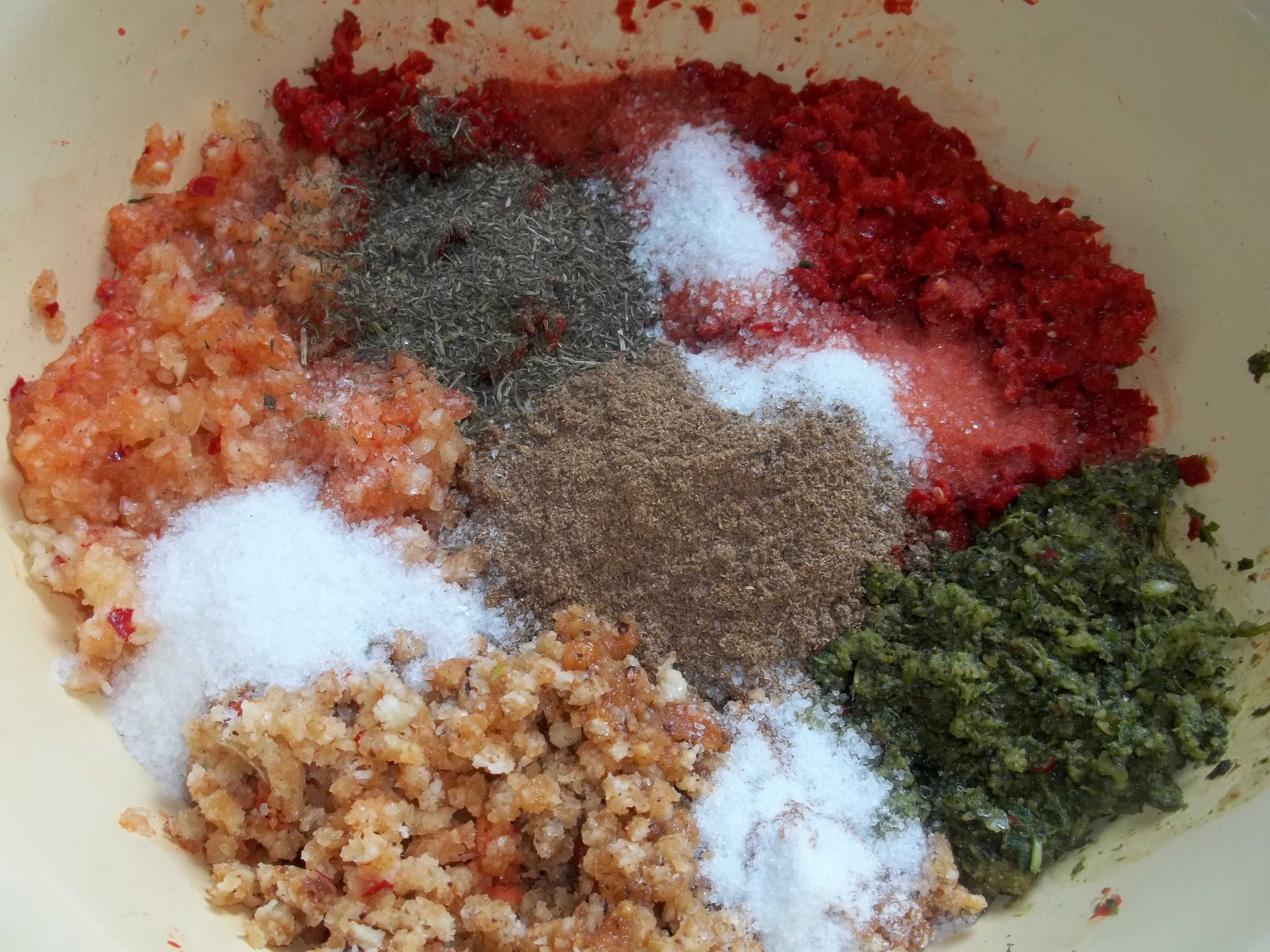 Use your hands to thoroughly mix the ajika. CAUTION: Wear gloves to do this or your fingers and hands will burn from the capsaicin (heat producing chemical) contained in the peppers.