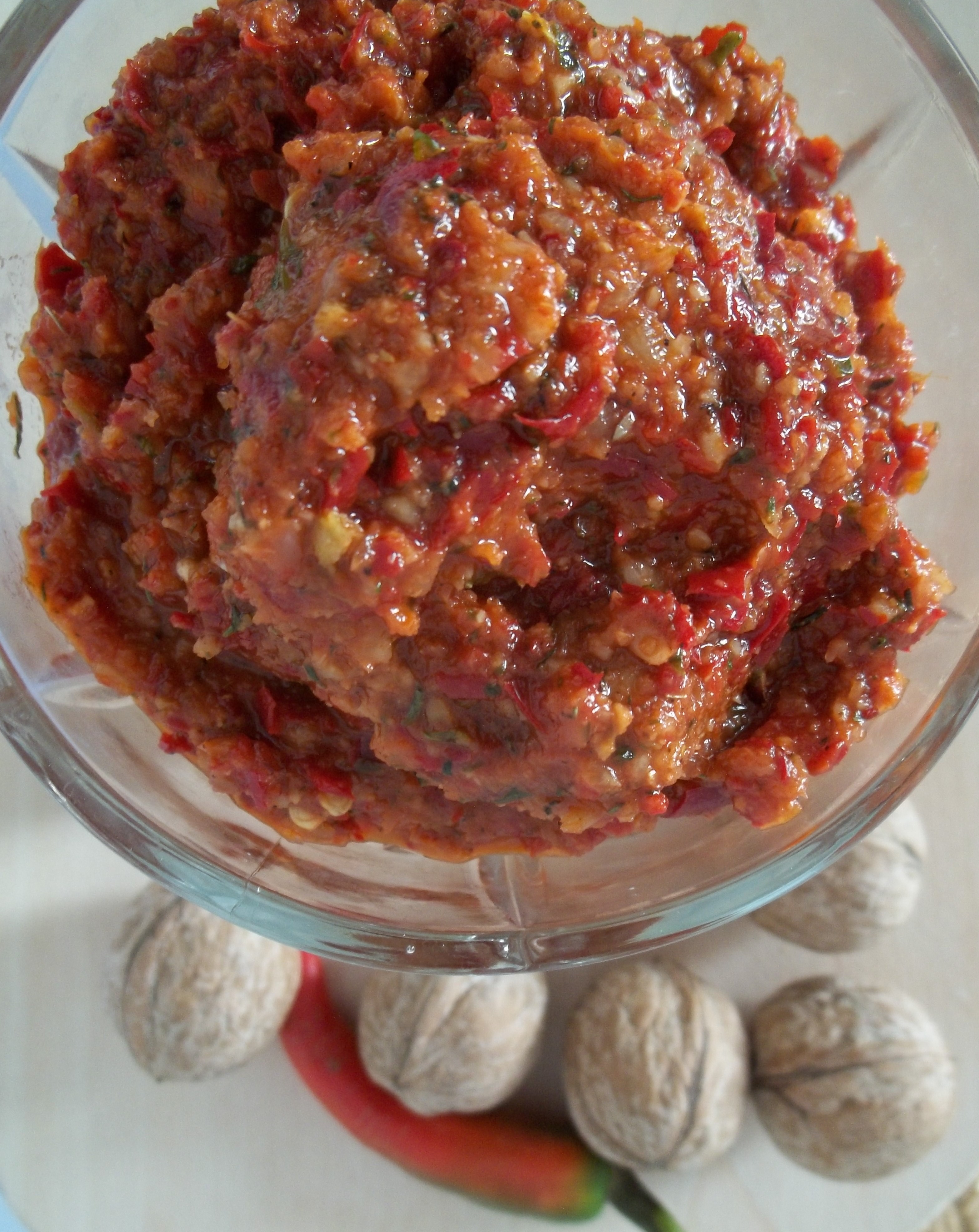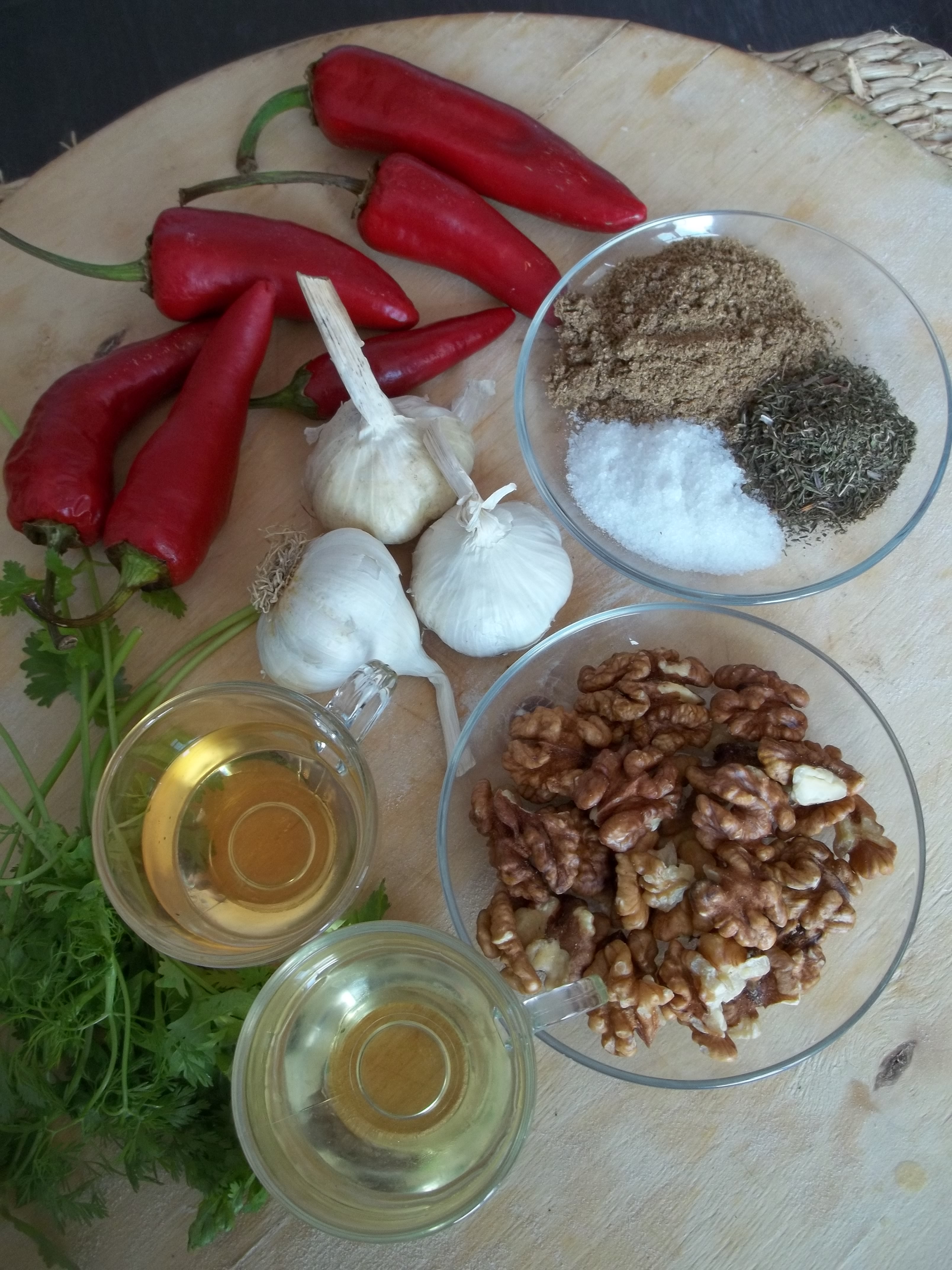 Ingredients: 1 kilo of hot red peppers, 400 grams of garlic, 300 grams of walnuts, 100 grams of fresh green coriander, 100 grams of dried coriander, 40 grams of dried Summer Savory, 50 ml of oil, 150 ml of white wine vinegar and salt (at least 50 grams).