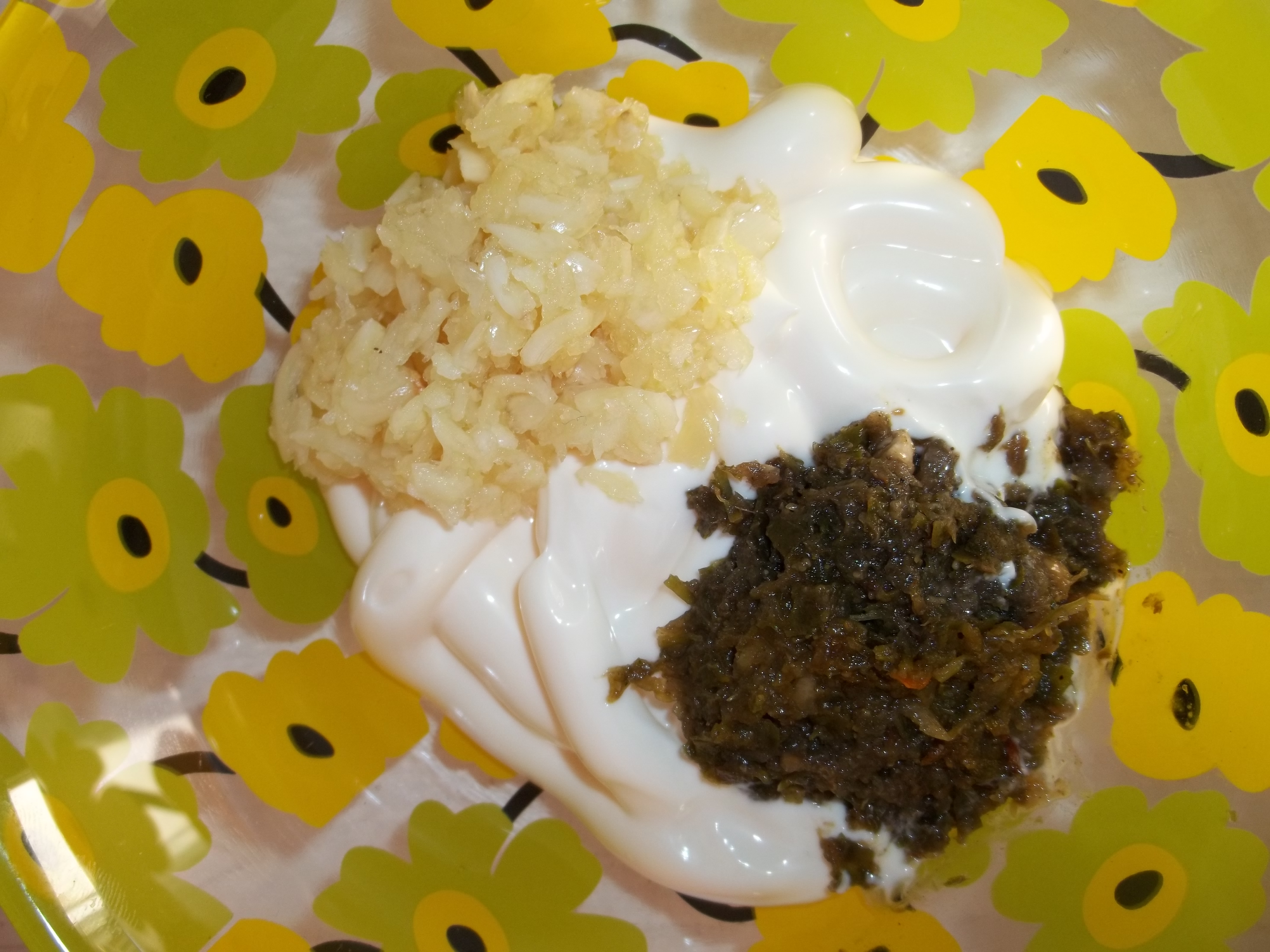 Add crushed garlic, mayonnaise (or sour cream) and 1 tsp of green ajika to a bowl. Stir and then add 100 ml of water in small amounts, stirring the mixture as you pour.