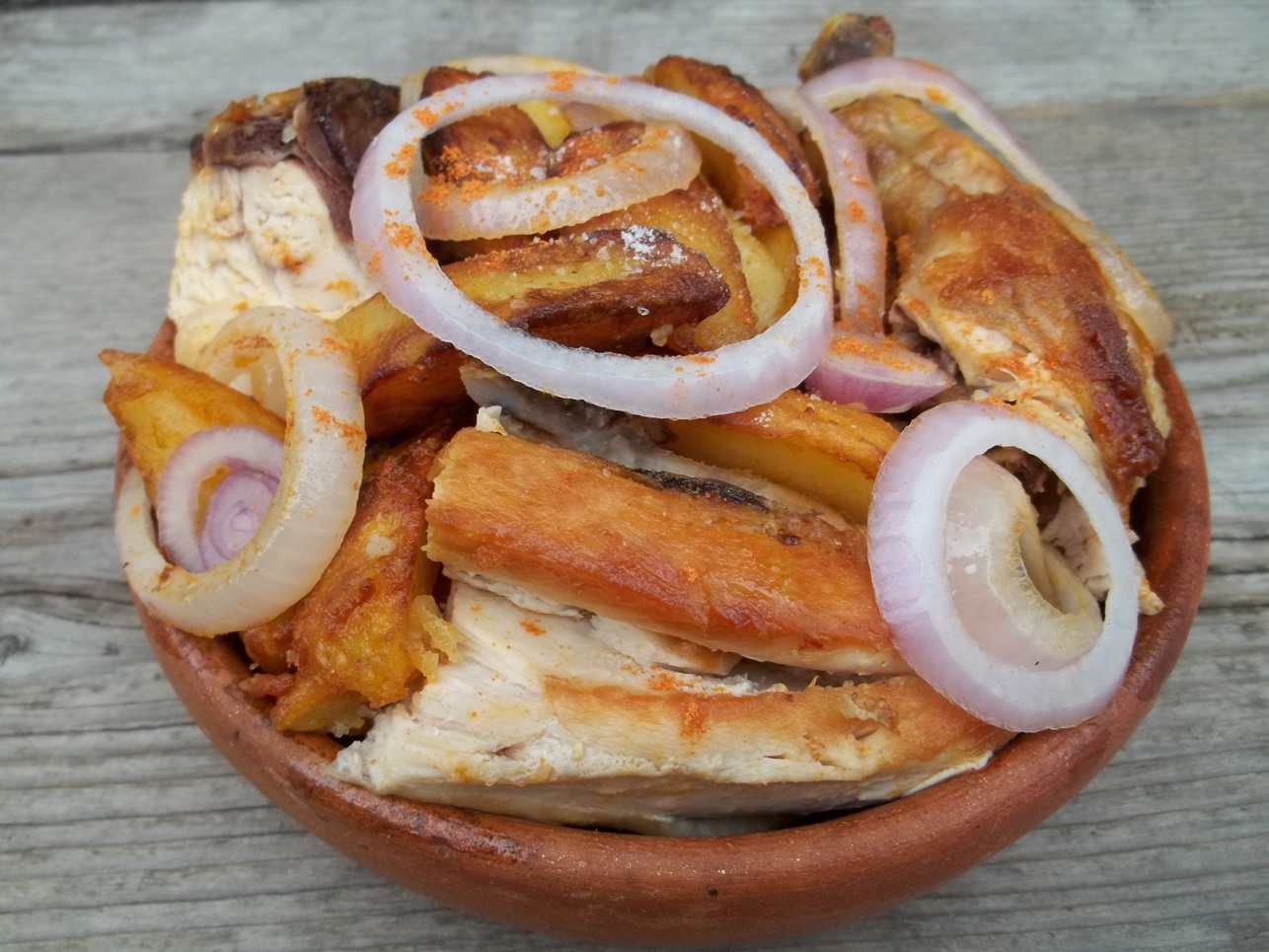 Ingredients: 1 whole chicken, 700 grams of potatoes, 1 large onion, 1 tbs of dried marigold, 10 tbs of oil and salt (amount dependent upon personal preference).