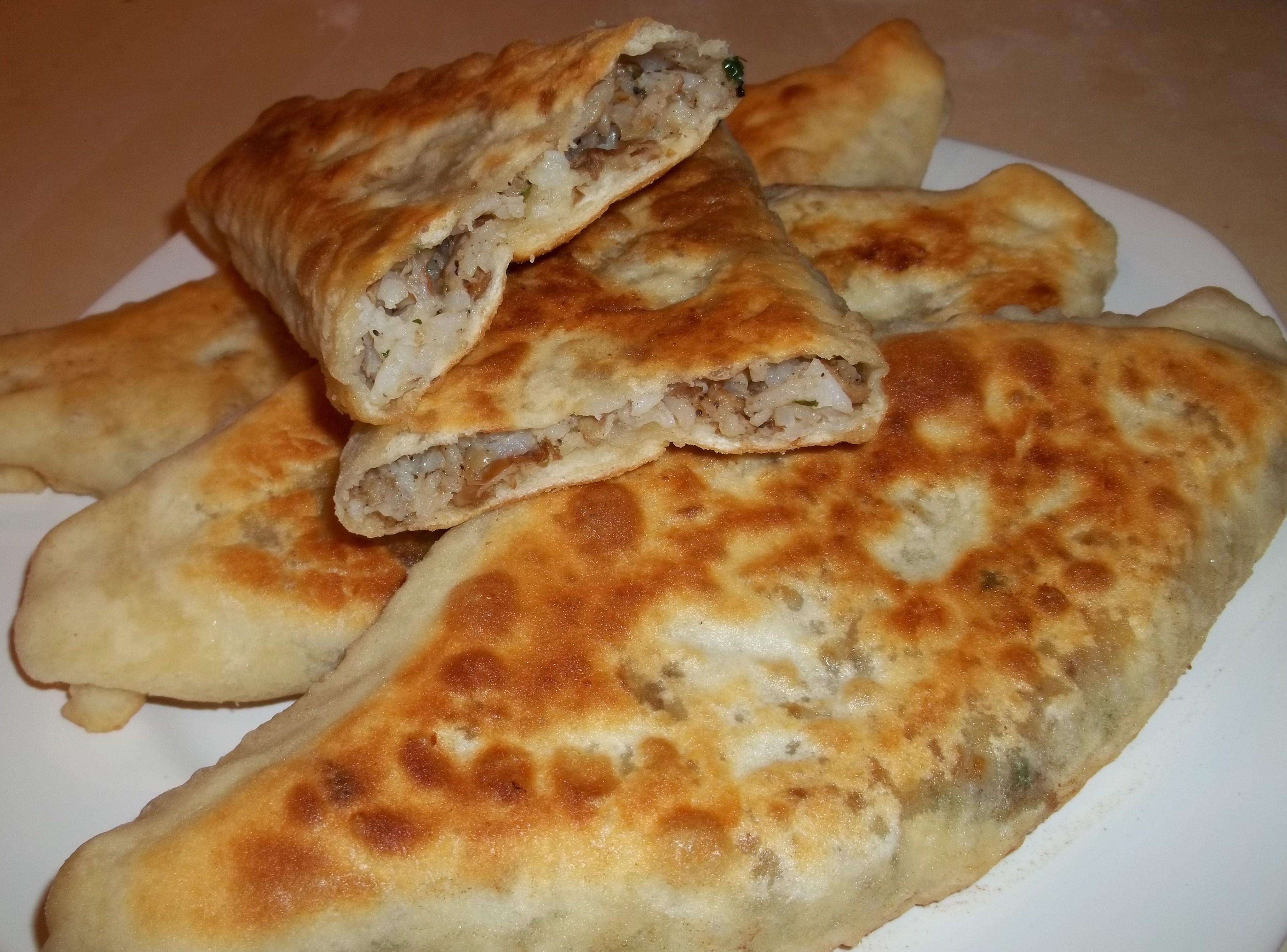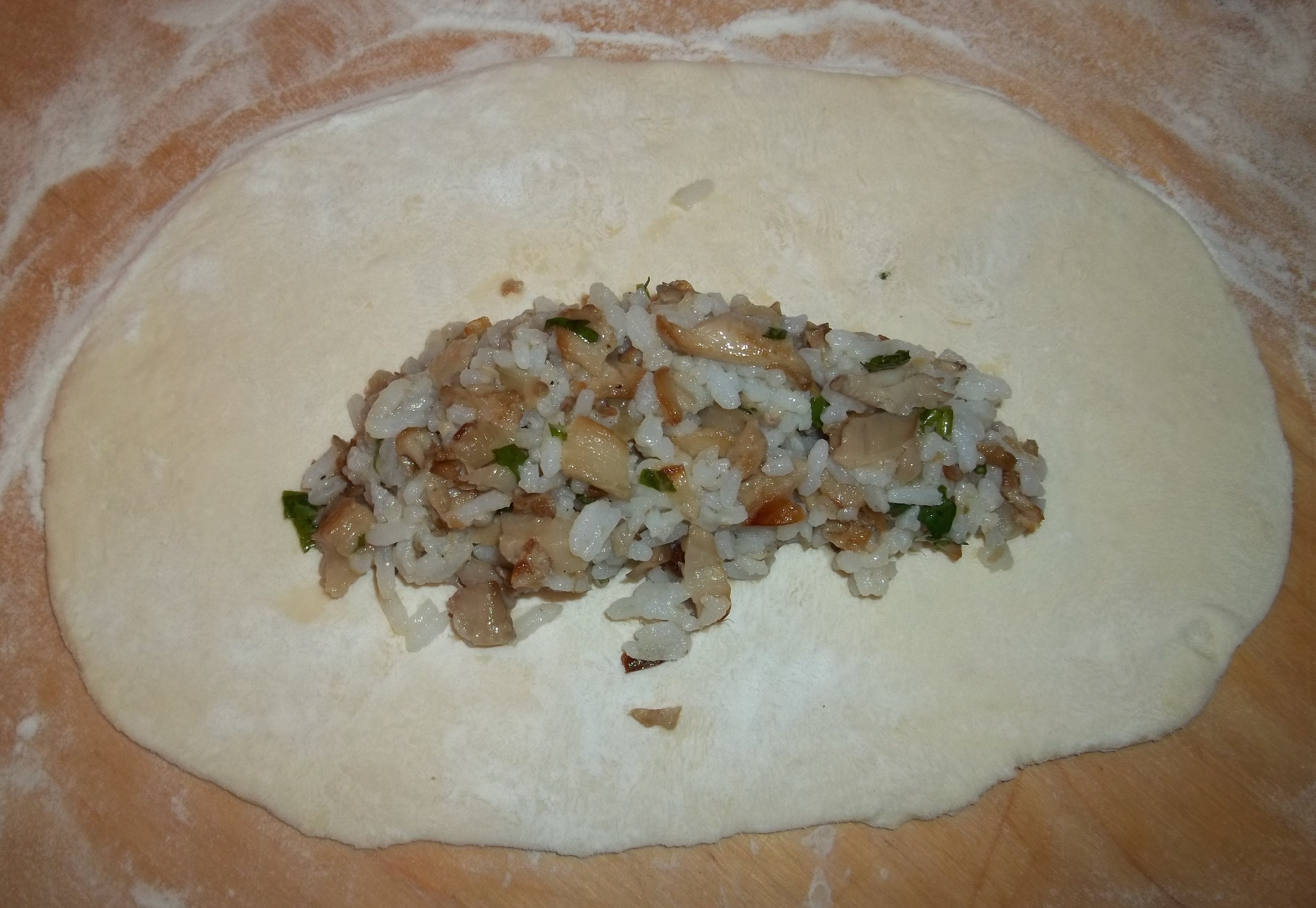 Ingredients for the filling (8 servings): 700 grams of wild oyster mushrooms, 100 grams of white rice, 1 large white onion, 1 tsp of black pepper, salt (amount dependent upon personal preference), 1 clove of garlic, 15 grams of fresh green parsley, 4-5 tbs of oil to fry the mushrooms and onions + oil for frying the pastries,
