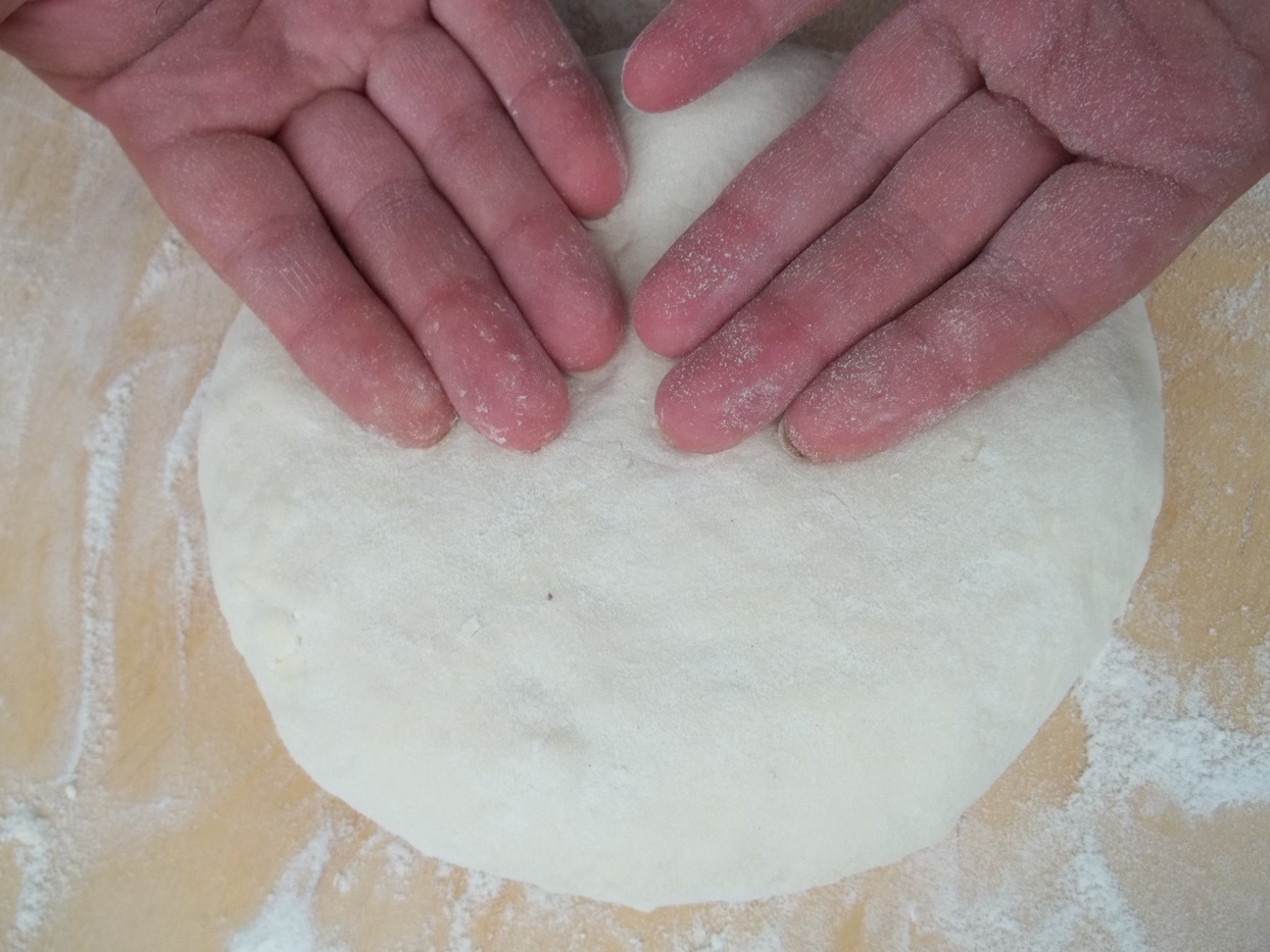 Turn it over and carefully press the filled dough into a circular shape that is less than 25 cm diameter. Don’t flatten it too much.