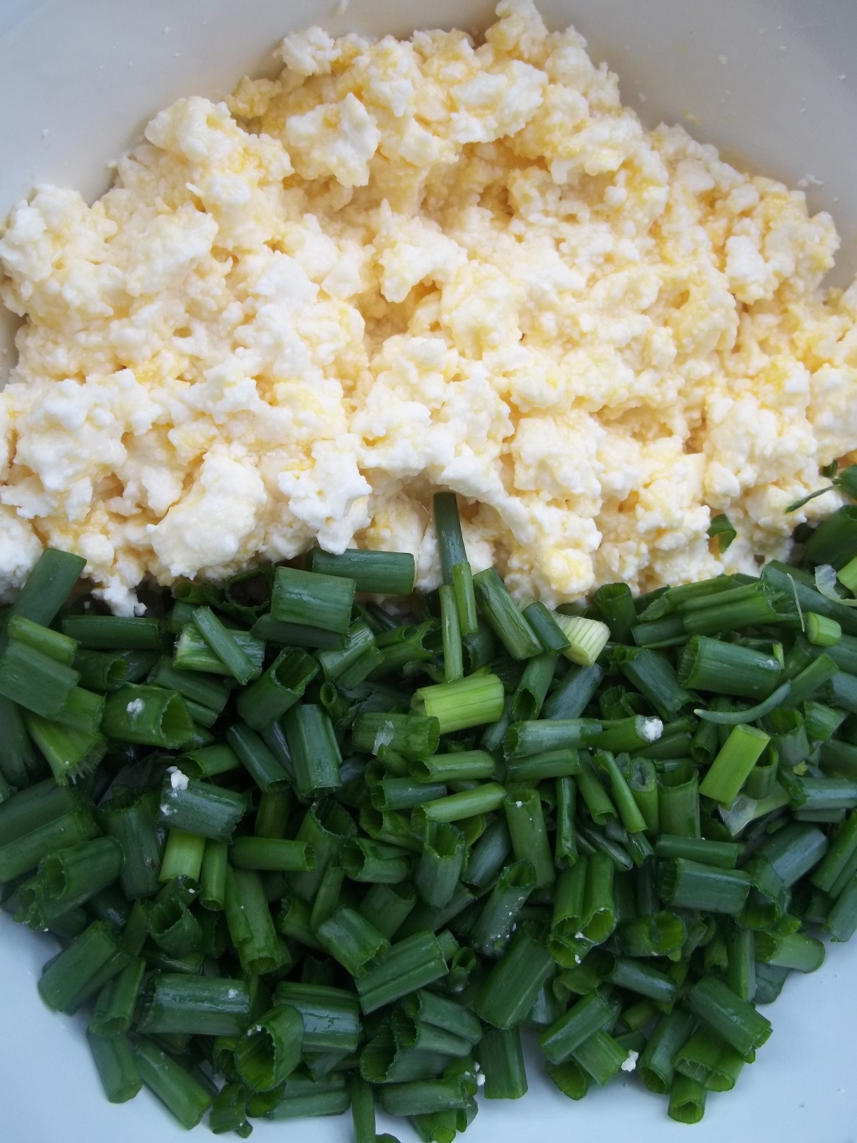 Ingredients (for the filling – for 3 servings): 500 grams of high fat cheese (we used Imeretian cheese), 36 green onions (more if they are small), and 3 eggs.