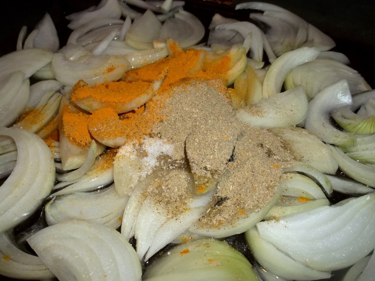 Chop the onions and add to a pan containing 100 ml of oil. Add the blue fenugreek and marigold spices. Stir and fry (covered) on a medium heat for 5-6 minutes, stirring occasionally.