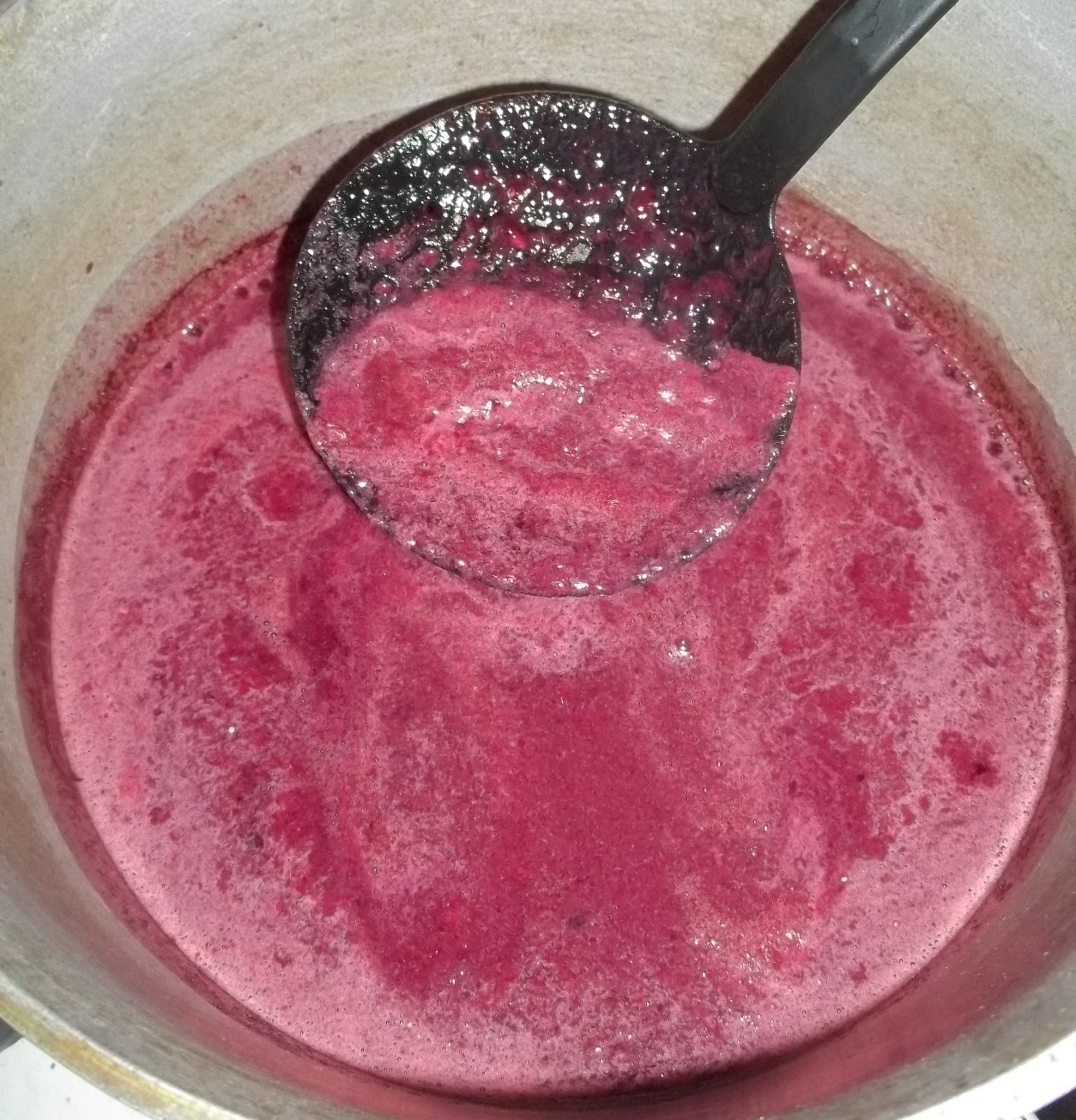 Monitor the simmering process and remove the extraneous matter whenever it forms on the surface of the grape liquid.