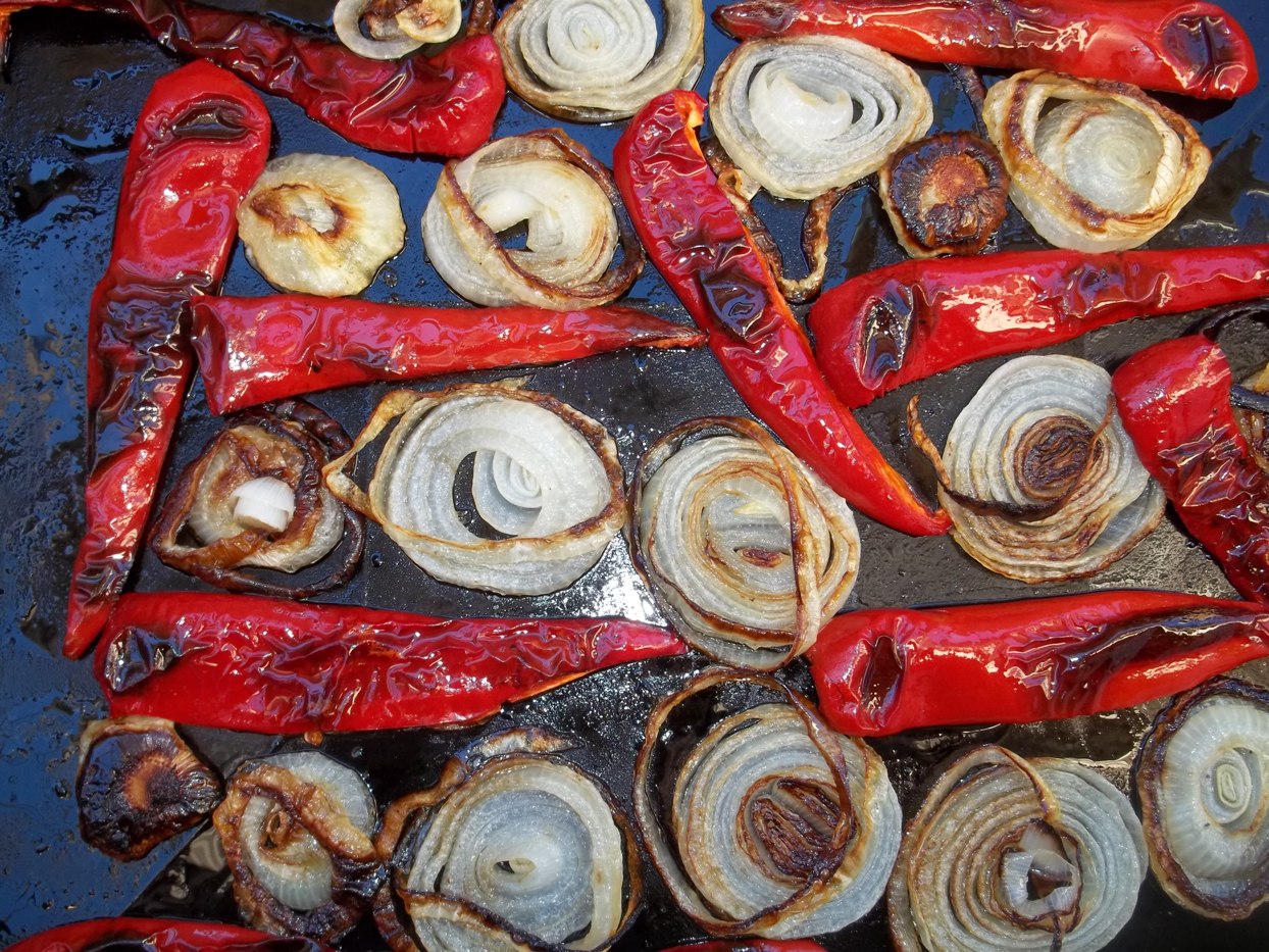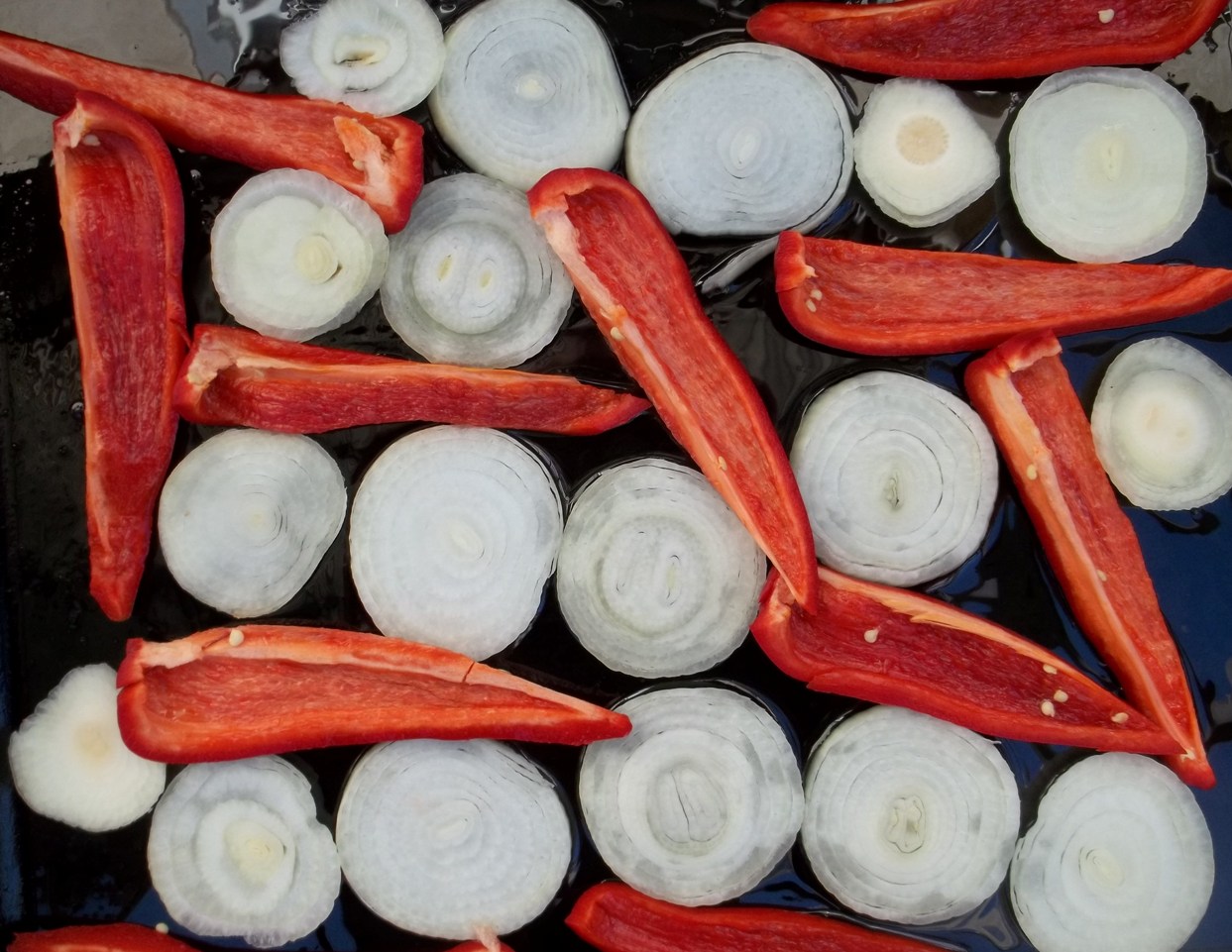 Preparation (red peppers and onions): Slice and remove the seeds from the red peppers. Slice the onions. Add 4 tbs of oil to a baking tray and add the red peppers and onions.