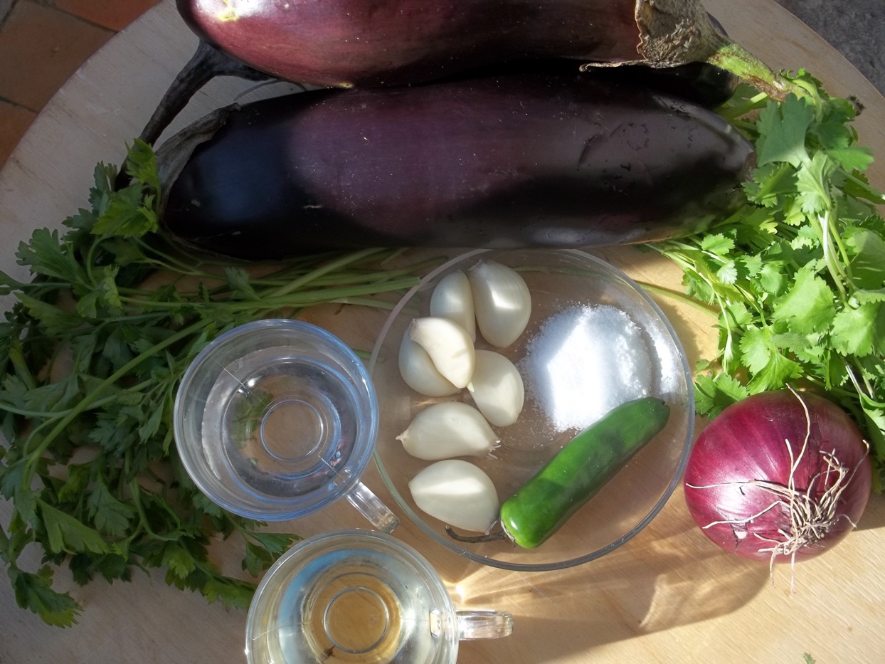 Ingredients: 2 large eggplants, 25 grams of fresh coriander, 25 grams of fresh parsley, 7 cloves of garlic, 1 medium size red onion, 1 hot green pepper, 8 tbs of oil, 2 tbs of white wine vinegar and salt (amount dependent upon personal preference).