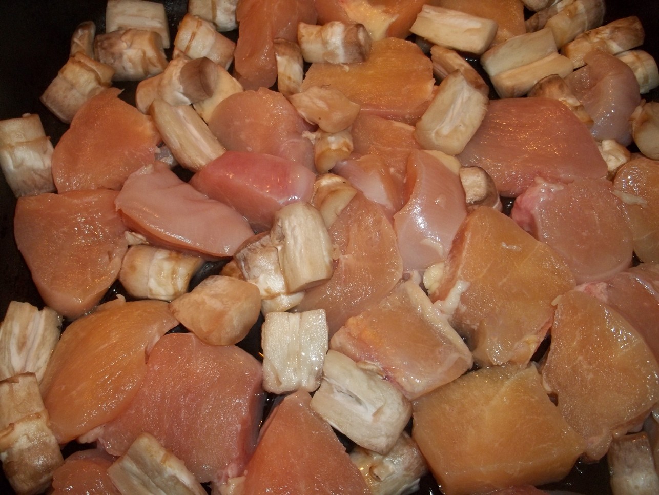 Preparation: Cut the chicken breast into medium sized pieces and remove the stalks from the mushrooms. Add the chicken piece and mushroom stalks to a pan with 3 tbs of oil and 3 tbs of water. Cover and fry on a medium heat for 5 minutes.