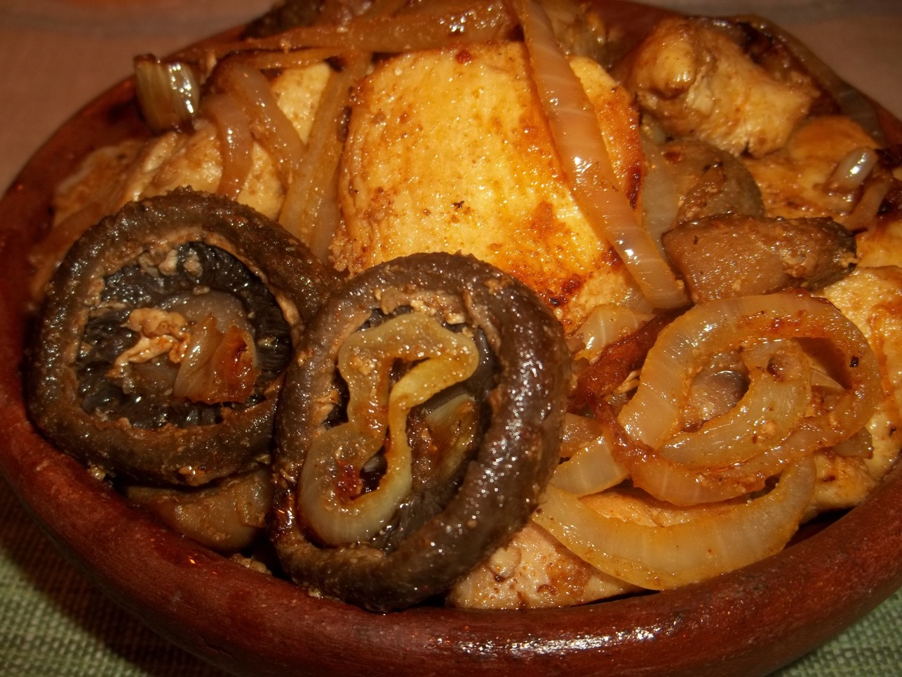 Ingredients: 600 grams of chicken breasts, 400 grams of mushrooms, 5 cloves of garlic, 2 large white onions, 50 grams of butter, 3 tbs of oil, 1 tsp of dried sweet red pepper and, salt (amount dependent upon personal preference).