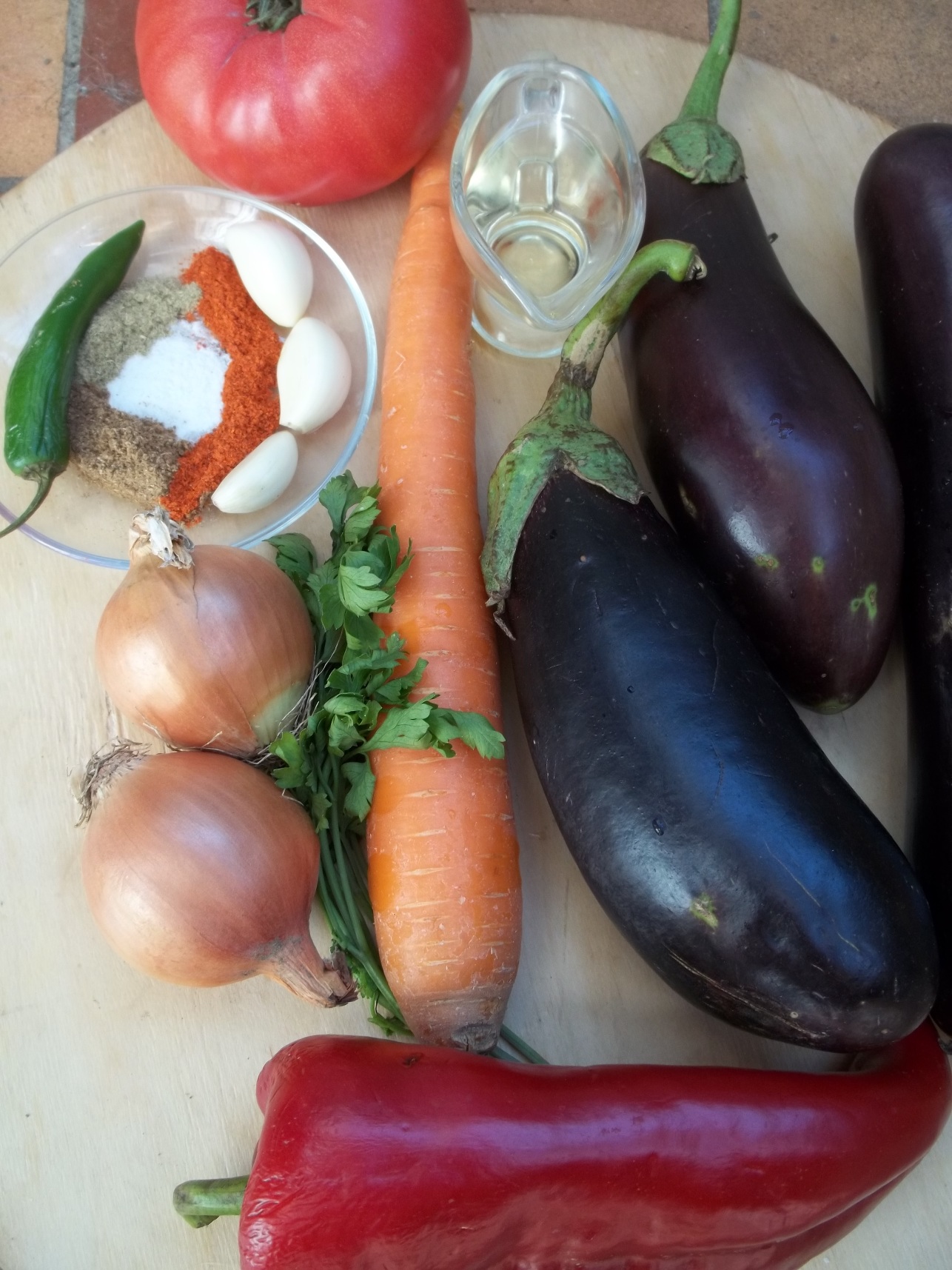 Ingredients: 3 large eggplants, 1 large tomato, 1 large carrot, 1 large sweet red pepper, 1 hot green pepper, 3 cloves of garlic, 1 level tbs of dried hot red pepper, 1 tsp of dried blue fenugreek, 1 tsp of dried coriander, 25 grams of fresh parsley, salt (amount dependent upon personal preference) and 10 tbs of oil.
