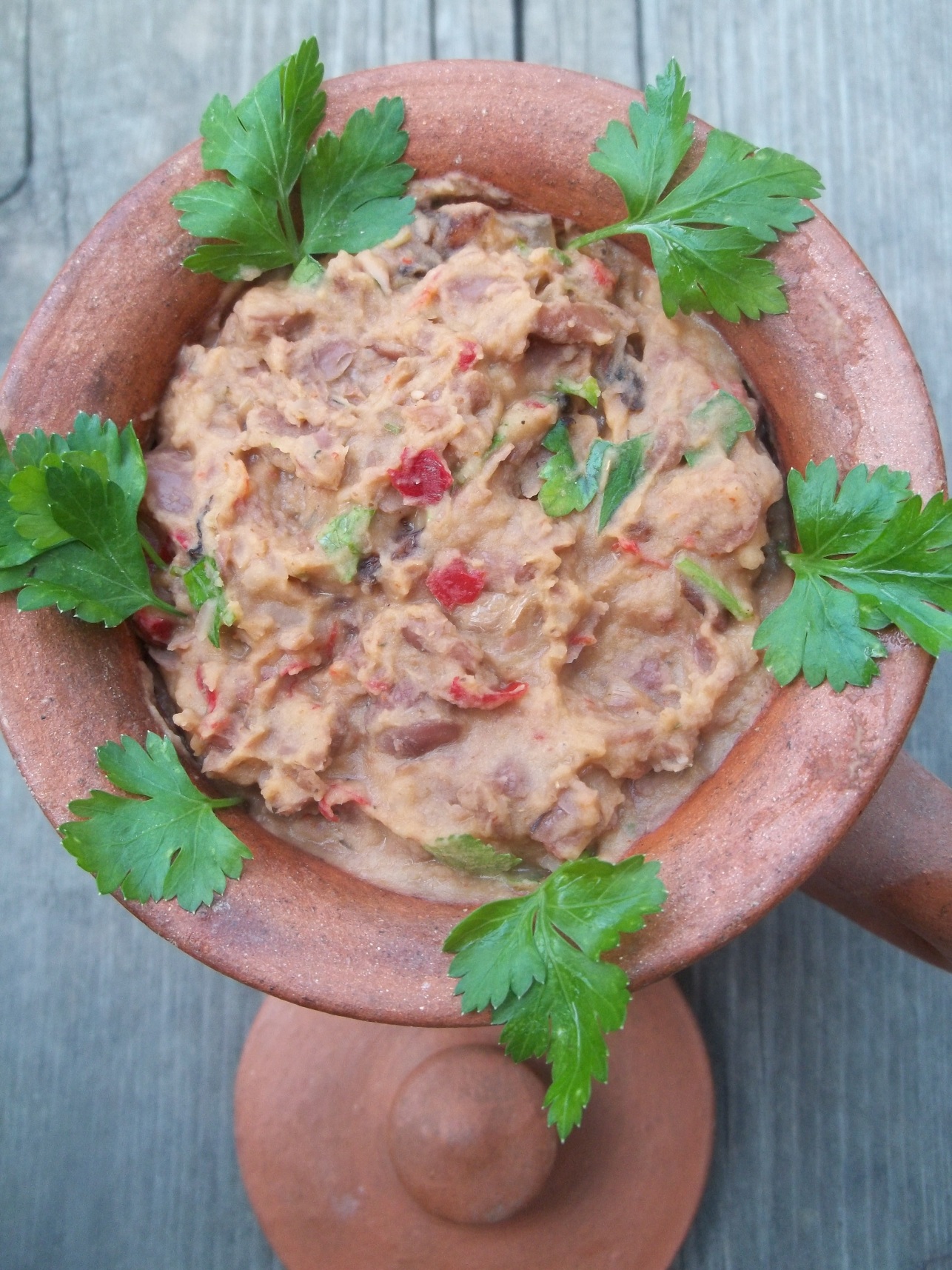 Crush the garlic and finely chop the parsley and add to the lobio, together with the summer savoury and dried coriander. Mix thoroughly.