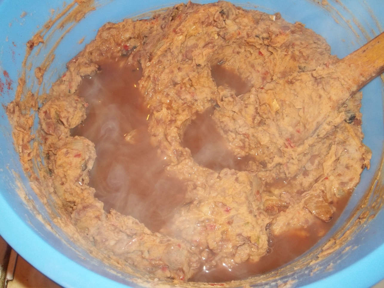 Add the 300 milliliters of bean water that was saved when draining the beans and stir until thoroughly mixed.