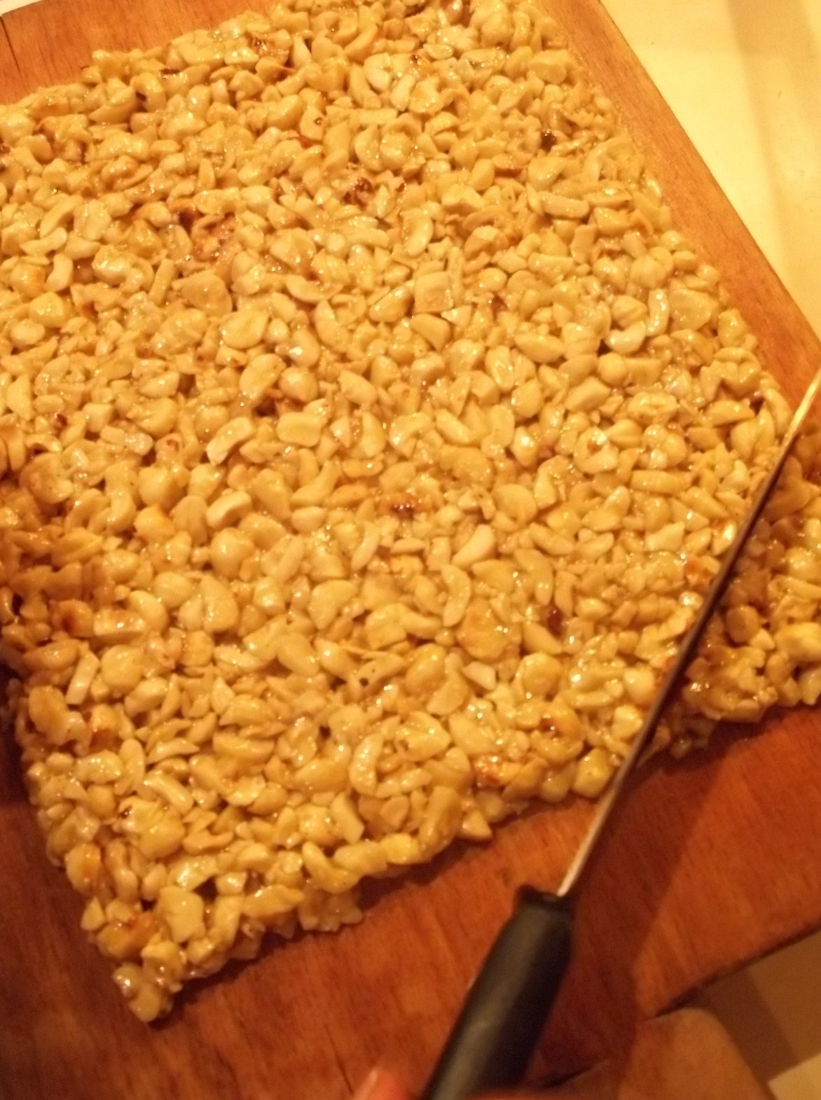 Heat a knife in a flame and cut the gozinaki into diagonal strips.